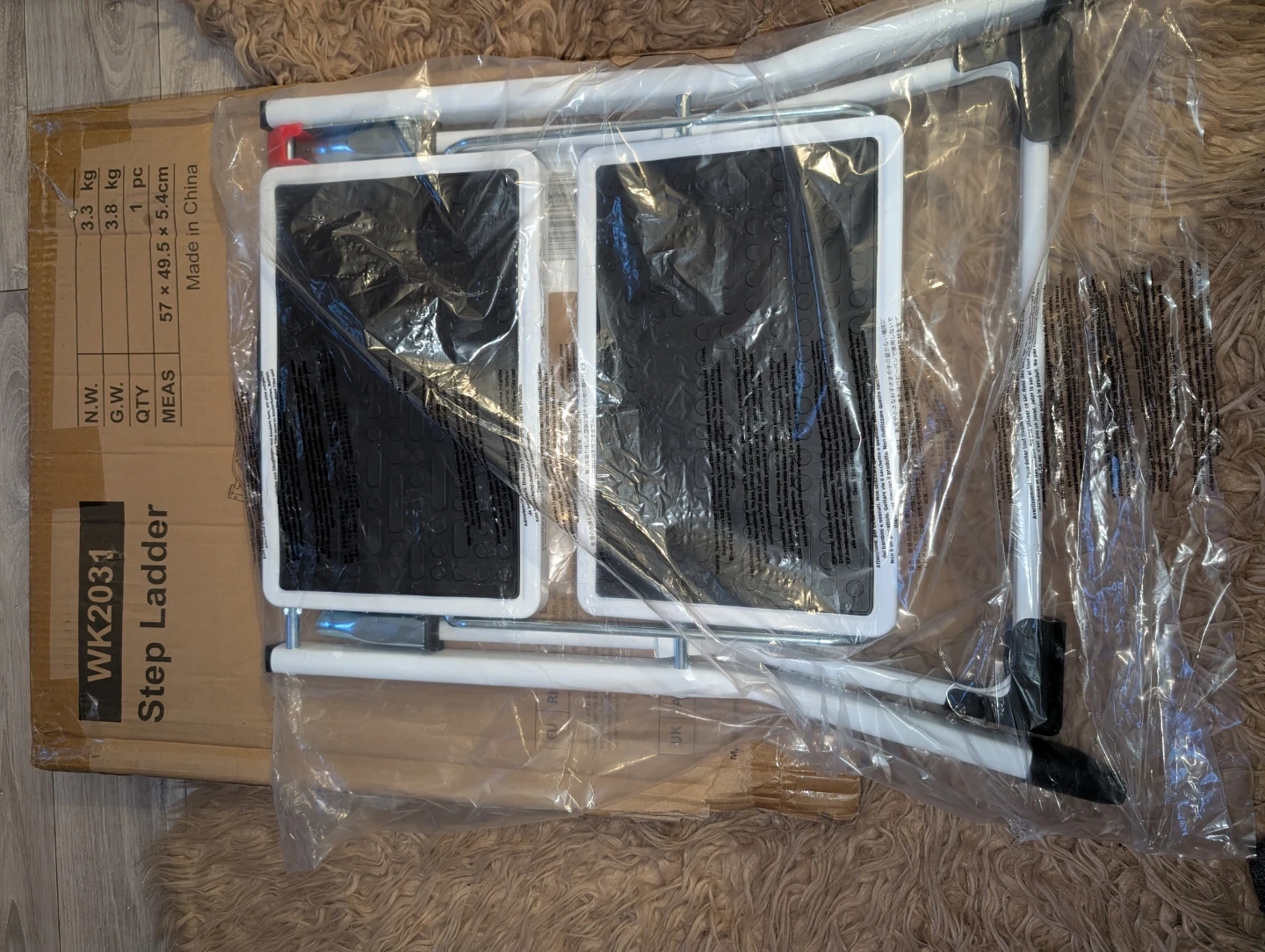 Selling a WK2031 step ladder in excellent condition! It's a lightweight and portable ladder that can support a maximum load of 330 lbs. The dimensions are approximately 27.17 inches in height when open and 30.31 inches when folded. Comes with the original box!