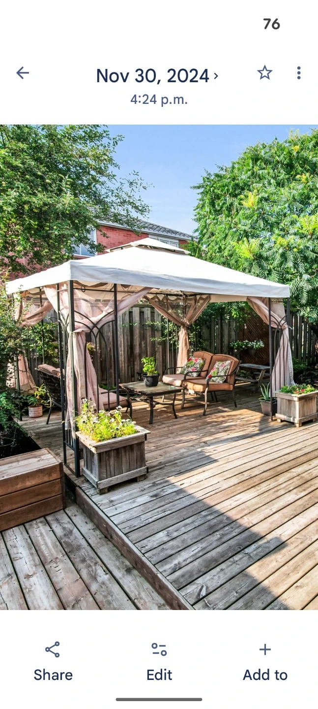 10x10 Gazebo with mosquito curtains. It provides ample shade for outdoor seating areas. This gazebo is perfect for summer gatherings on your deck or patio. I am also including a free Fan to keep you cool in the summer!