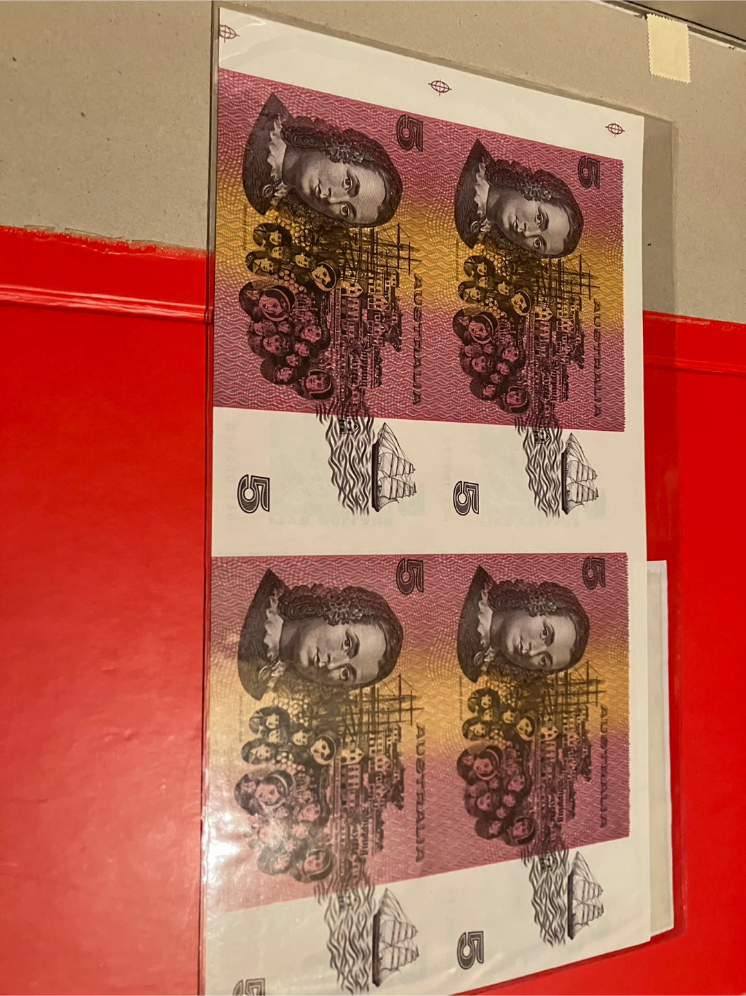 Uncirculated sheet of 4 Australian 5 dollar banknotes. Features low serial numbers for collectors. This is a genuine Reserve Bank of Australia issue.