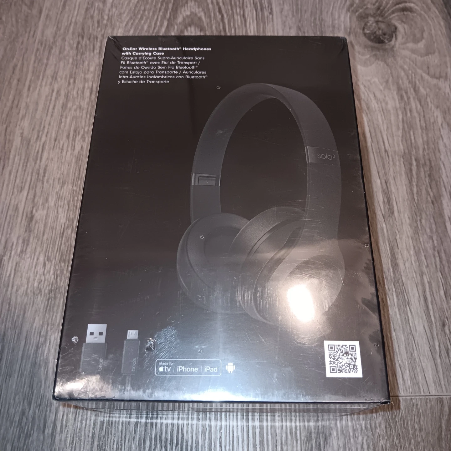 Brand new. Sealed. On-ear wireless Bluetooth headphones in black. Offers up to 40 hours of battery life. Comes with a USB charging cable and a carrying case.