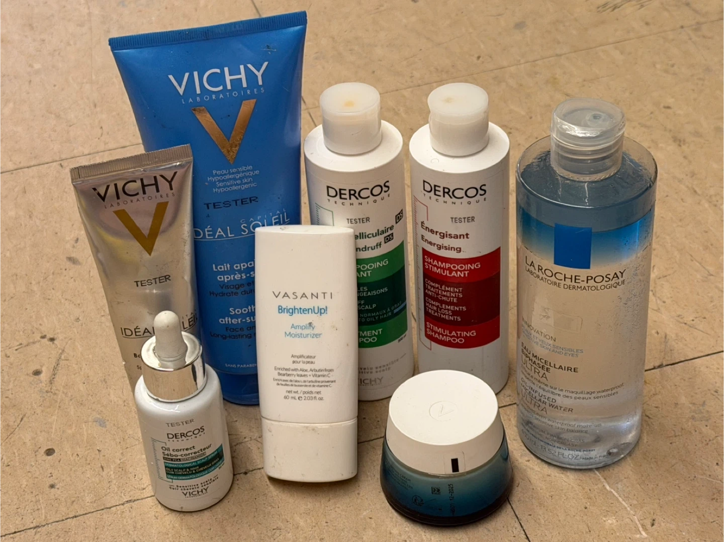 This lot includes a variety of skincare and haircare products from popular brands. There's a Vichy Ideal Soleil face lotion, Vichy Dercos oil correct serum, Vasanti BrightenUp! Amplify Moisturizer, Dercos stimulating shampoo, and La Roche-Posay micellar water. Great for anyone looking to refresh their beauty routine!