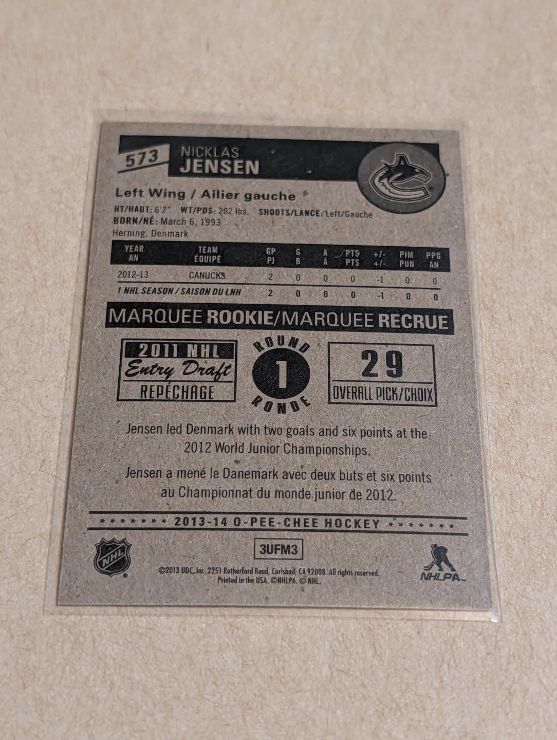 OPC 13/14 Marquee Rookies Nicklas Jensen Hockey Card