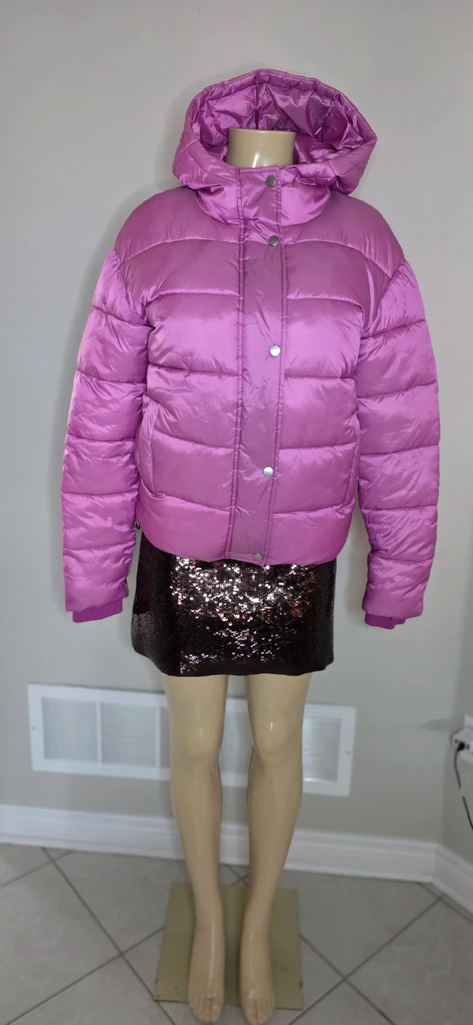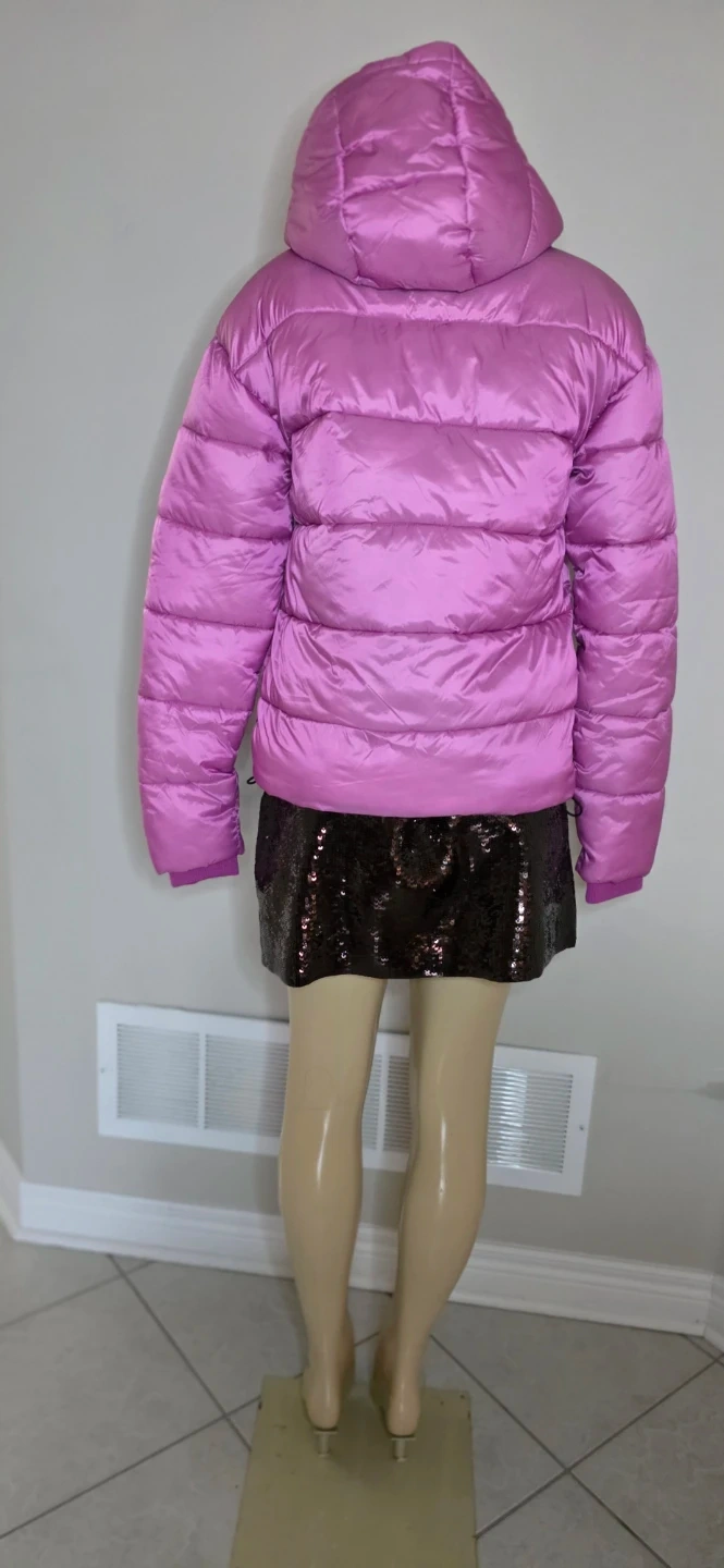 This is a super puff shorty jacket in a lovely lilac bloom colour! It's perfect for keeping you warm and stylish. The jacket is made with high-quality materials and is designed to be lightweight and portable.