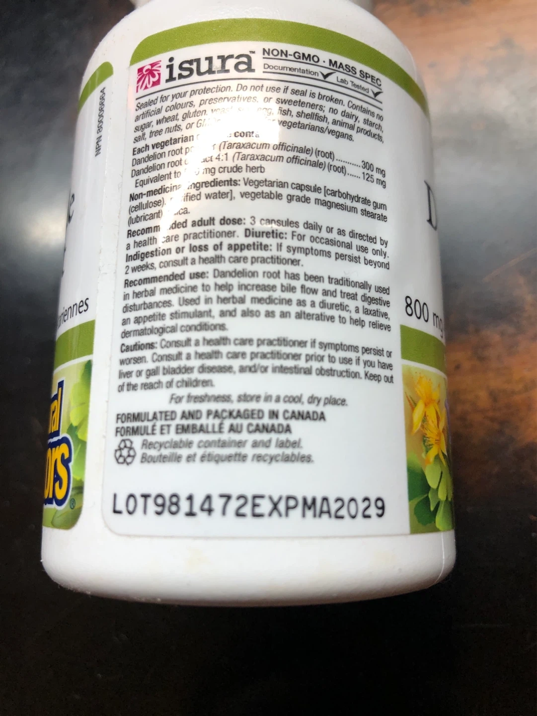 Natural Factors Dandelion Root 800 mg vegetarian capsules. Contains 90 capsules per bottle. Formulated and packaged in Canada. EXP MAR2029.