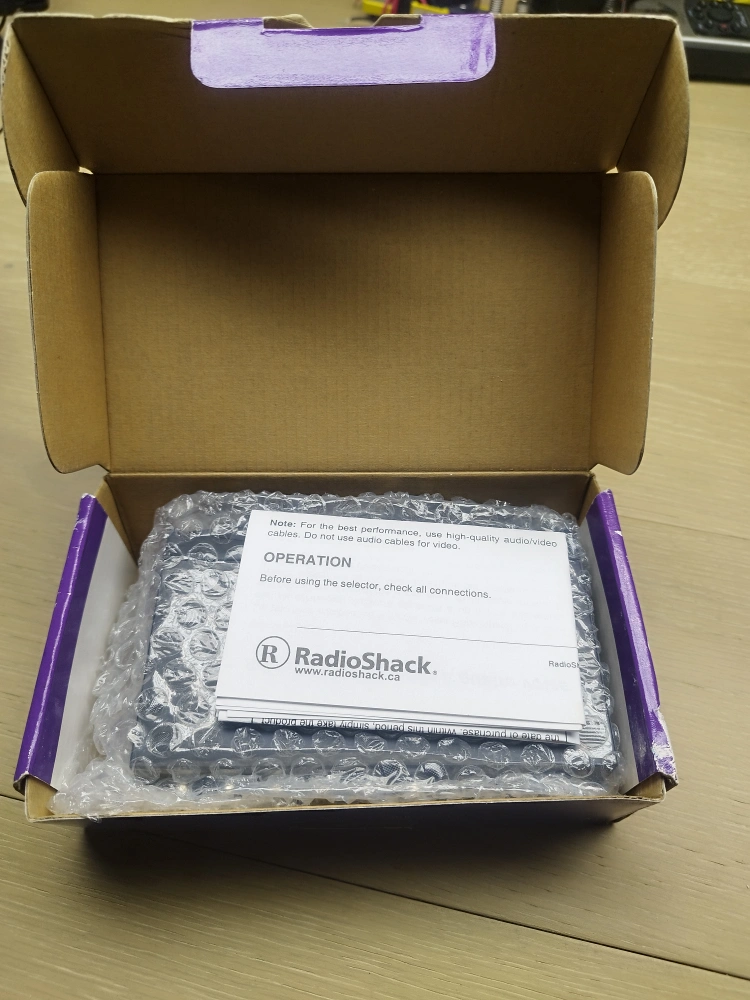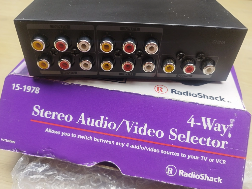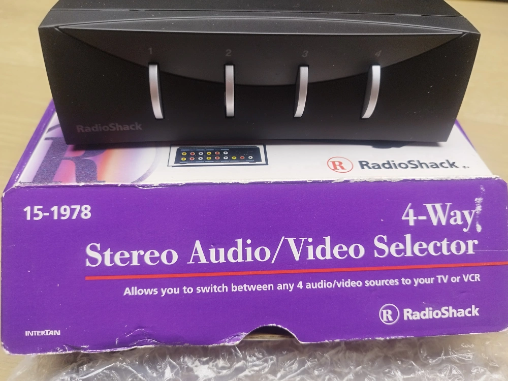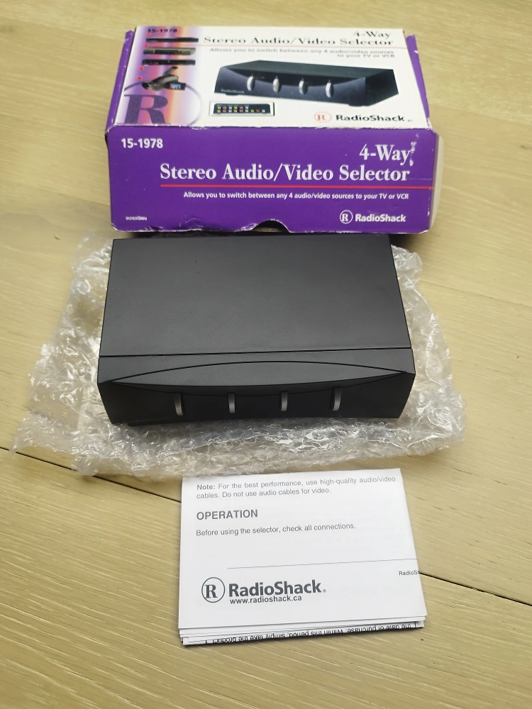Vintage RadioShack 4-way stereo audio/video selector. Allows switching between four audio/video sources. Includes original box. Model number 15-1978.