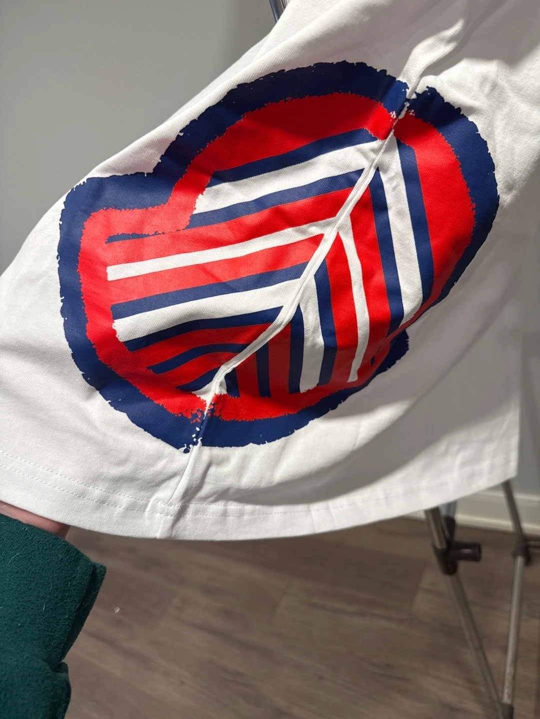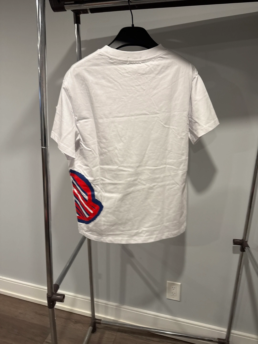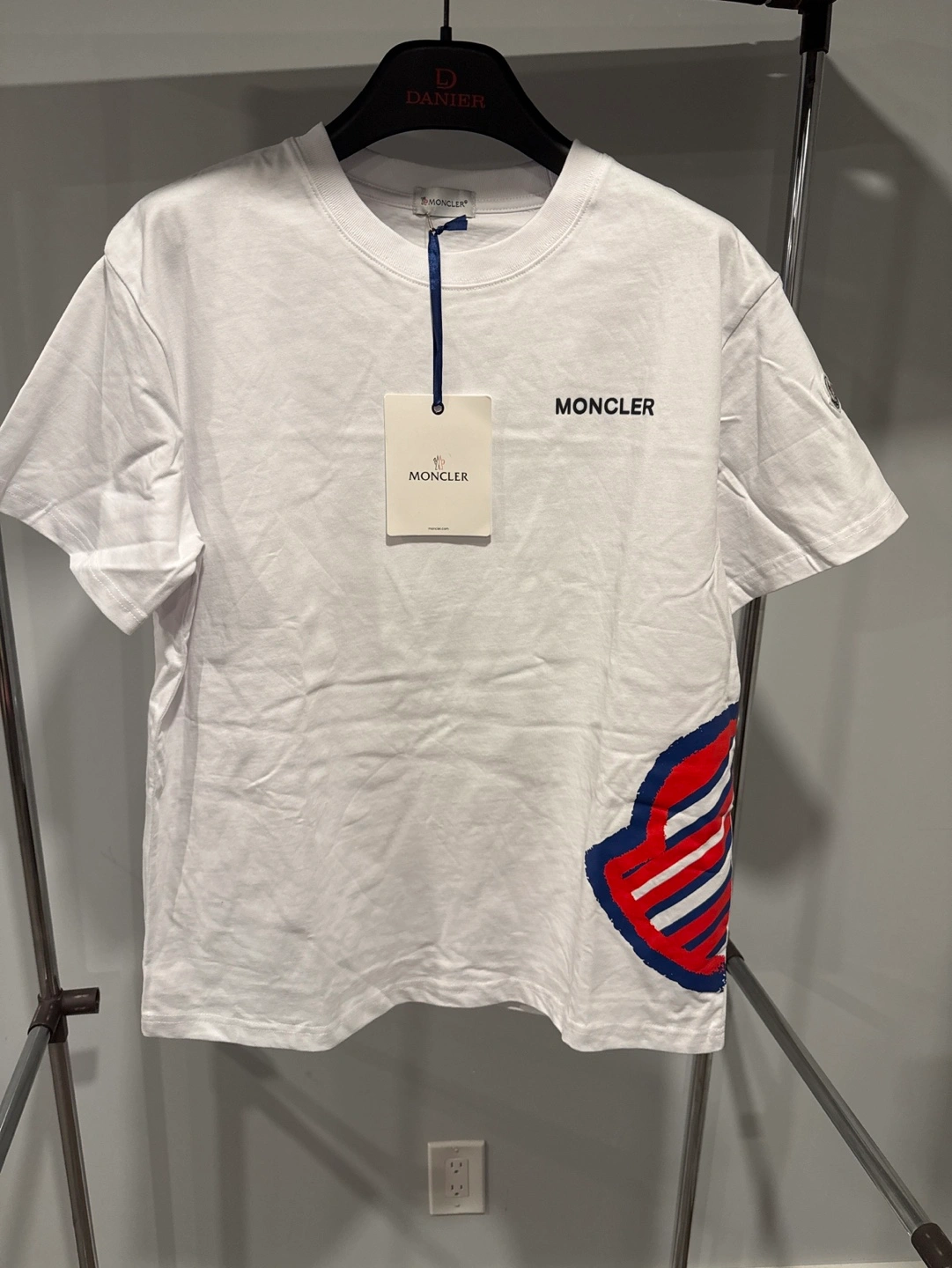 Men's Moncler t-shirt. White cotton. Features a logo on the sleeve and a graphic print on the side. New with tags.