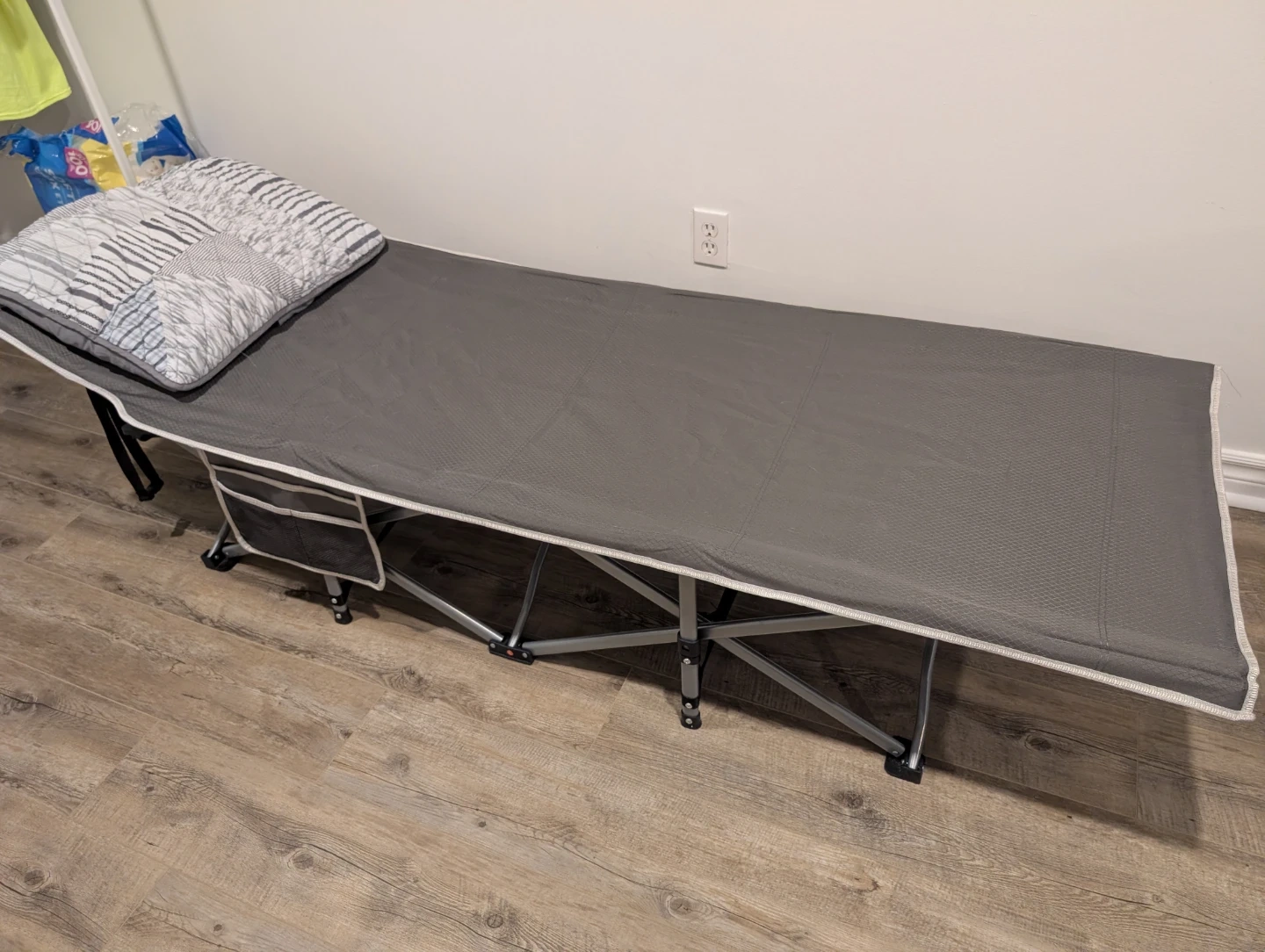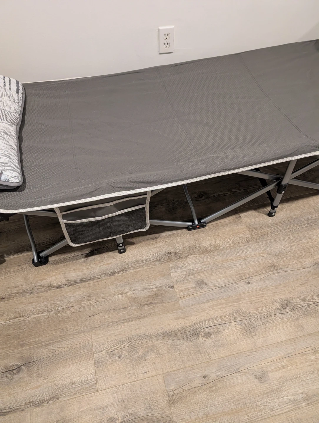 This is a grey folding camping cot. It has a durable fabric surface and a sturdy metal frame. Includes side storage pockets. Purschased a couple weeks ago from Amazon used as a temporary bed. Asking only 40.0