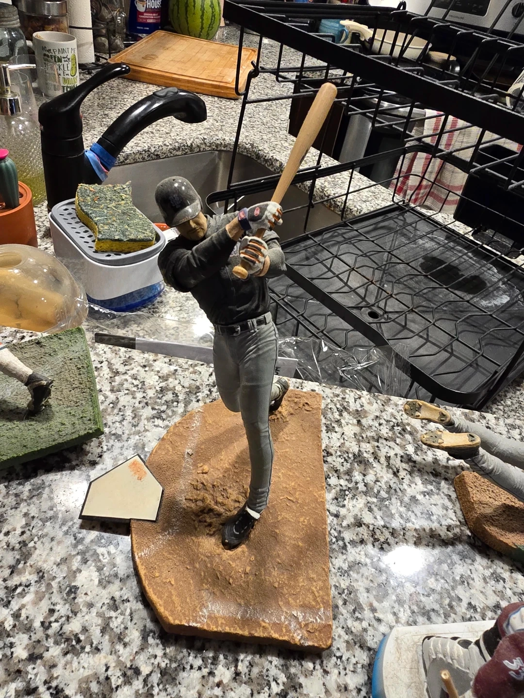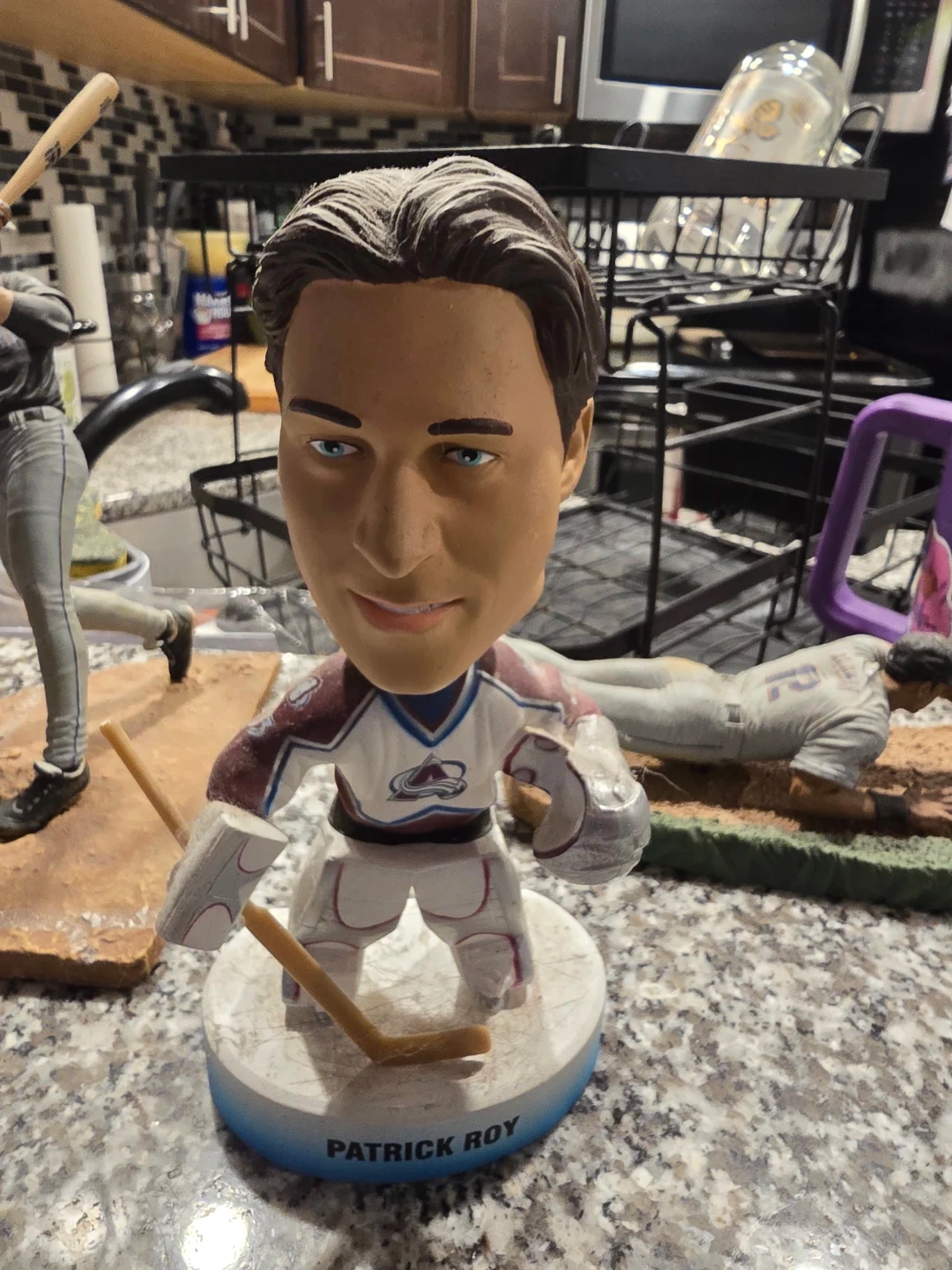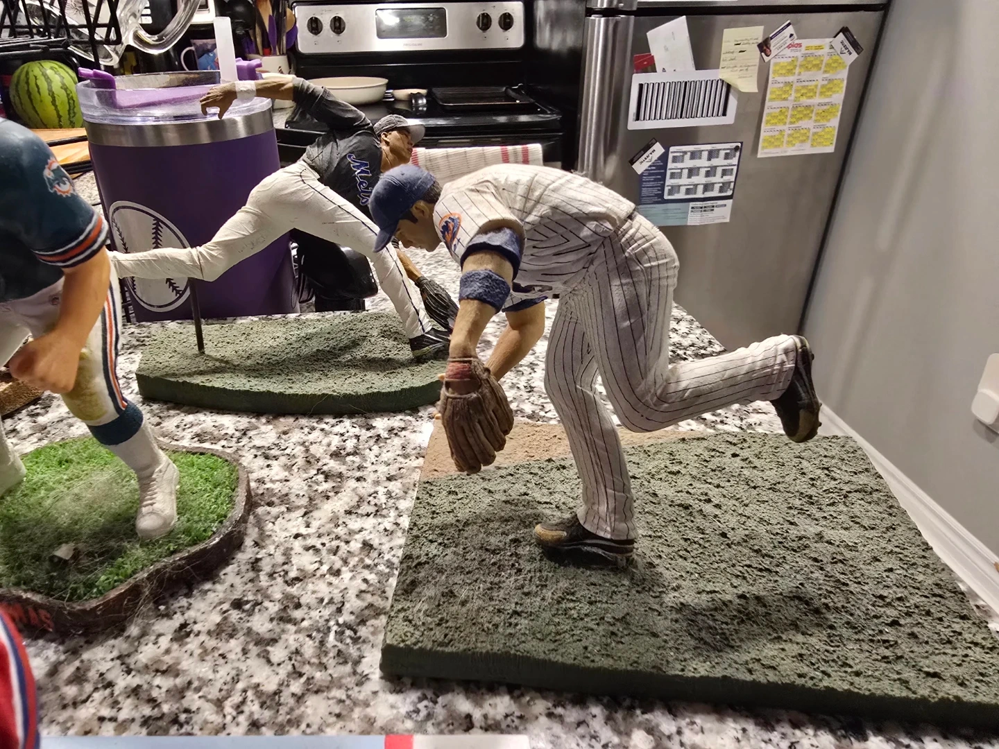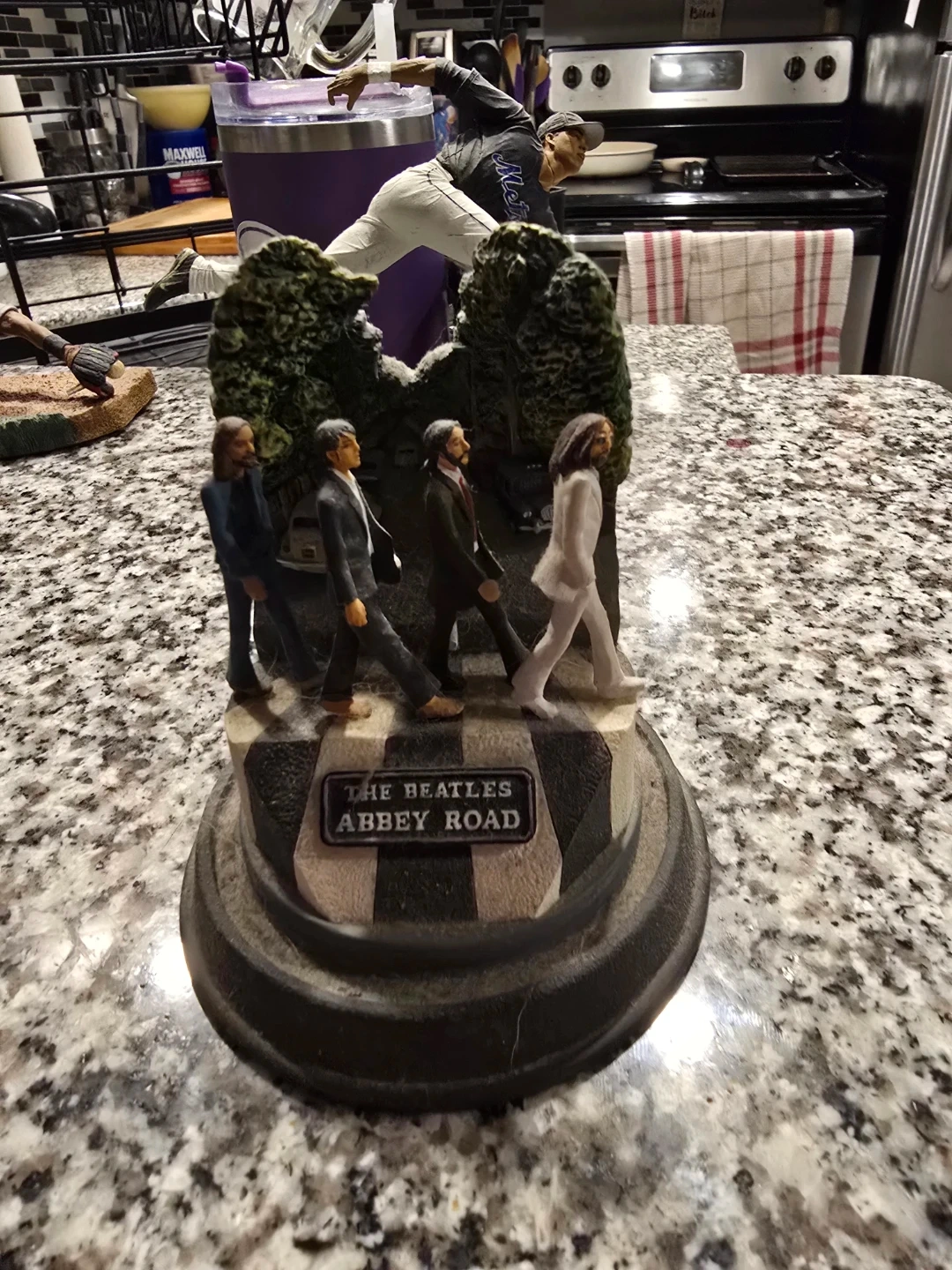 A collectible figurine depicting The Beatles walking across Abbey Road. This detailed piece captures the iconic album cover. It's a great display item for any music fan! Plus baseball, hockey and football figurine.