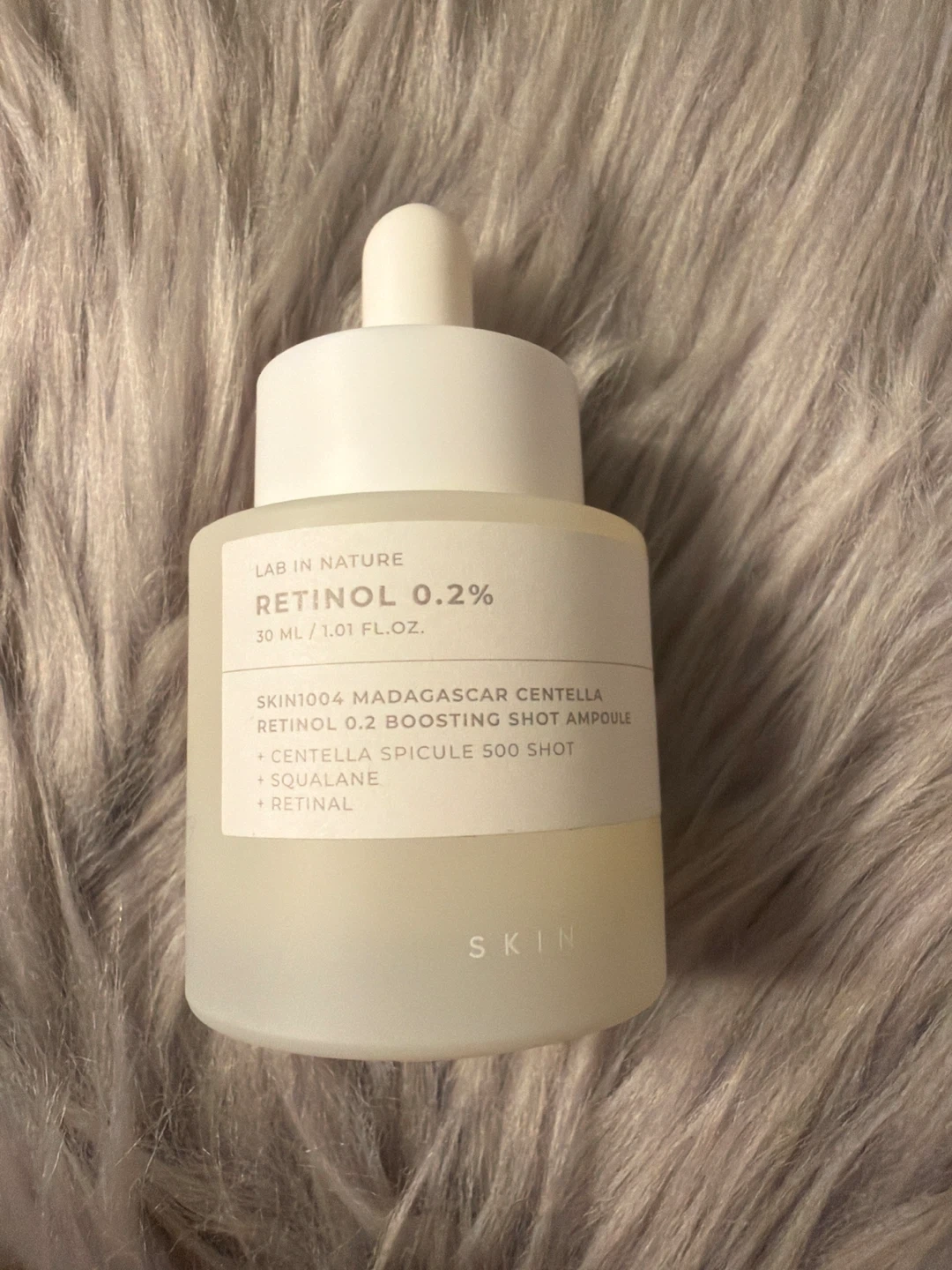 This is the SKIN1004 Madagascar Centella Retinol 0.2 Boosting Shot Ampoule. It contains 30ml or 1.01 fl. oz. of product. The formula includes Centella Asiatica, Squalane, and Retinal.
