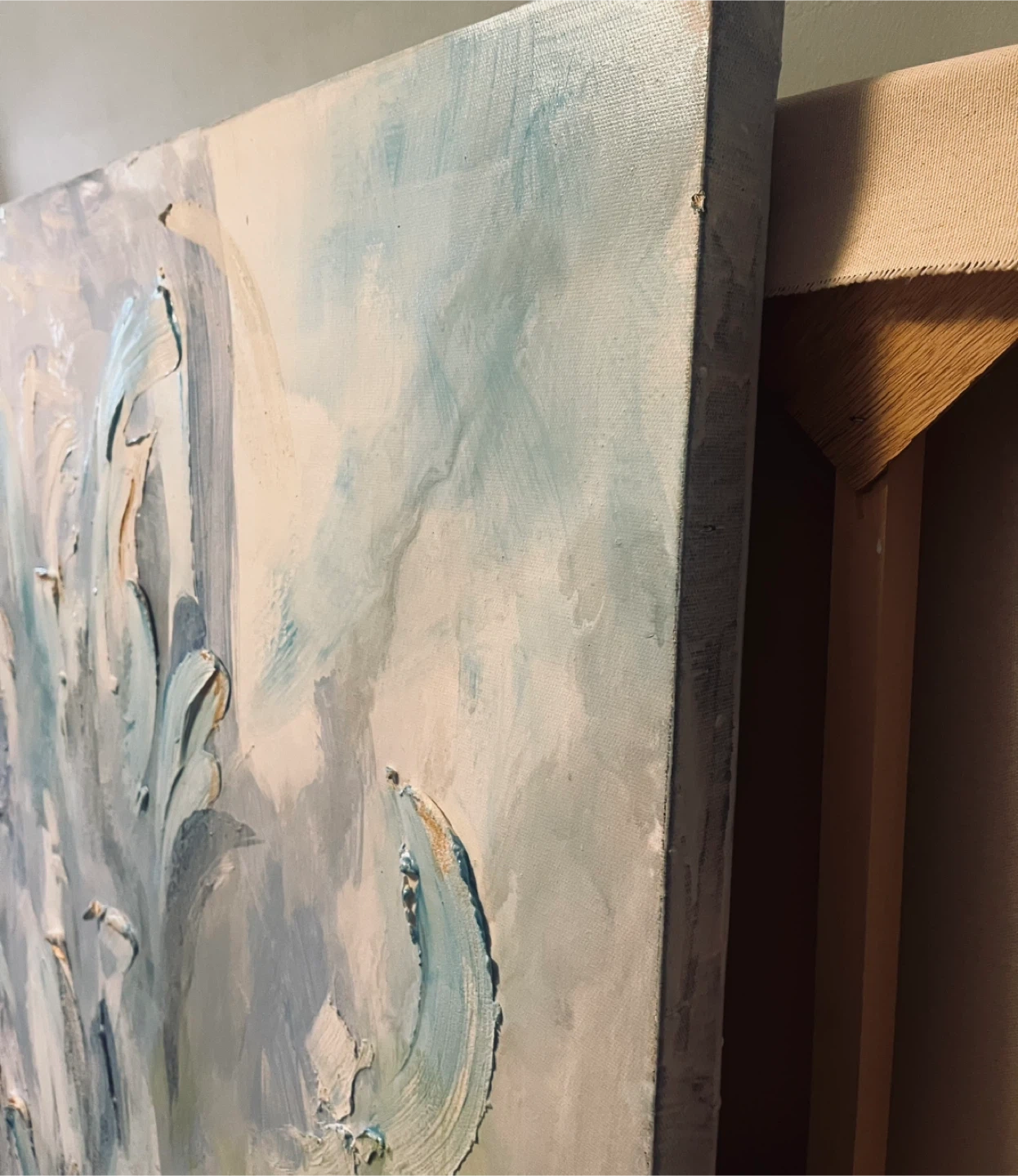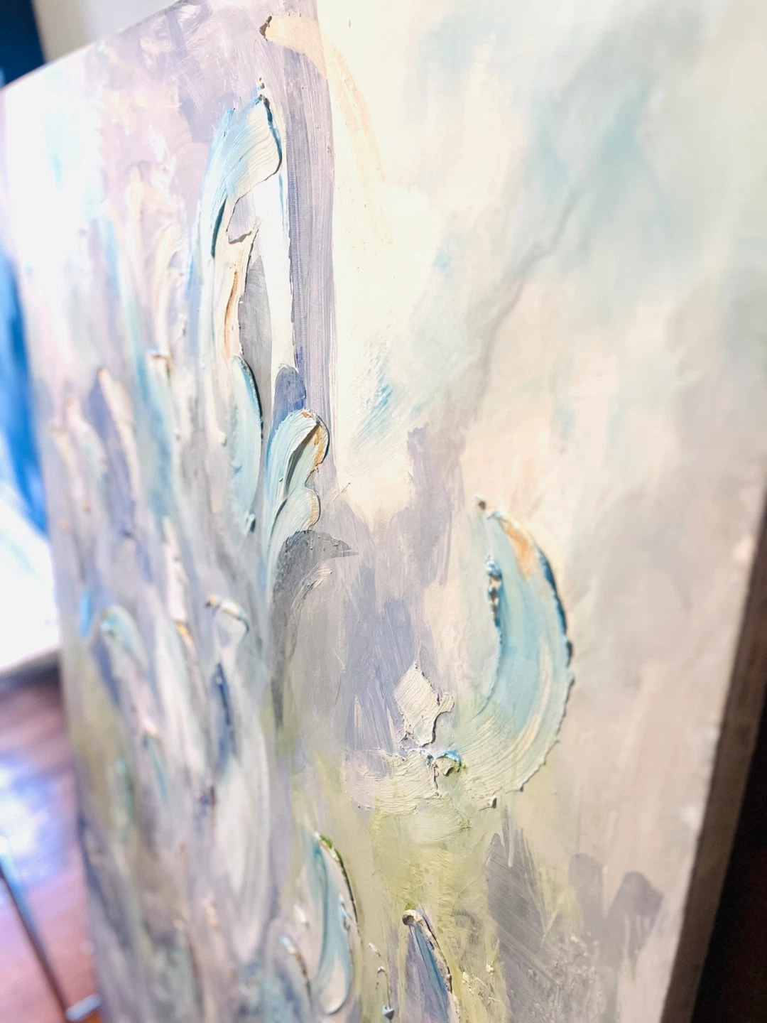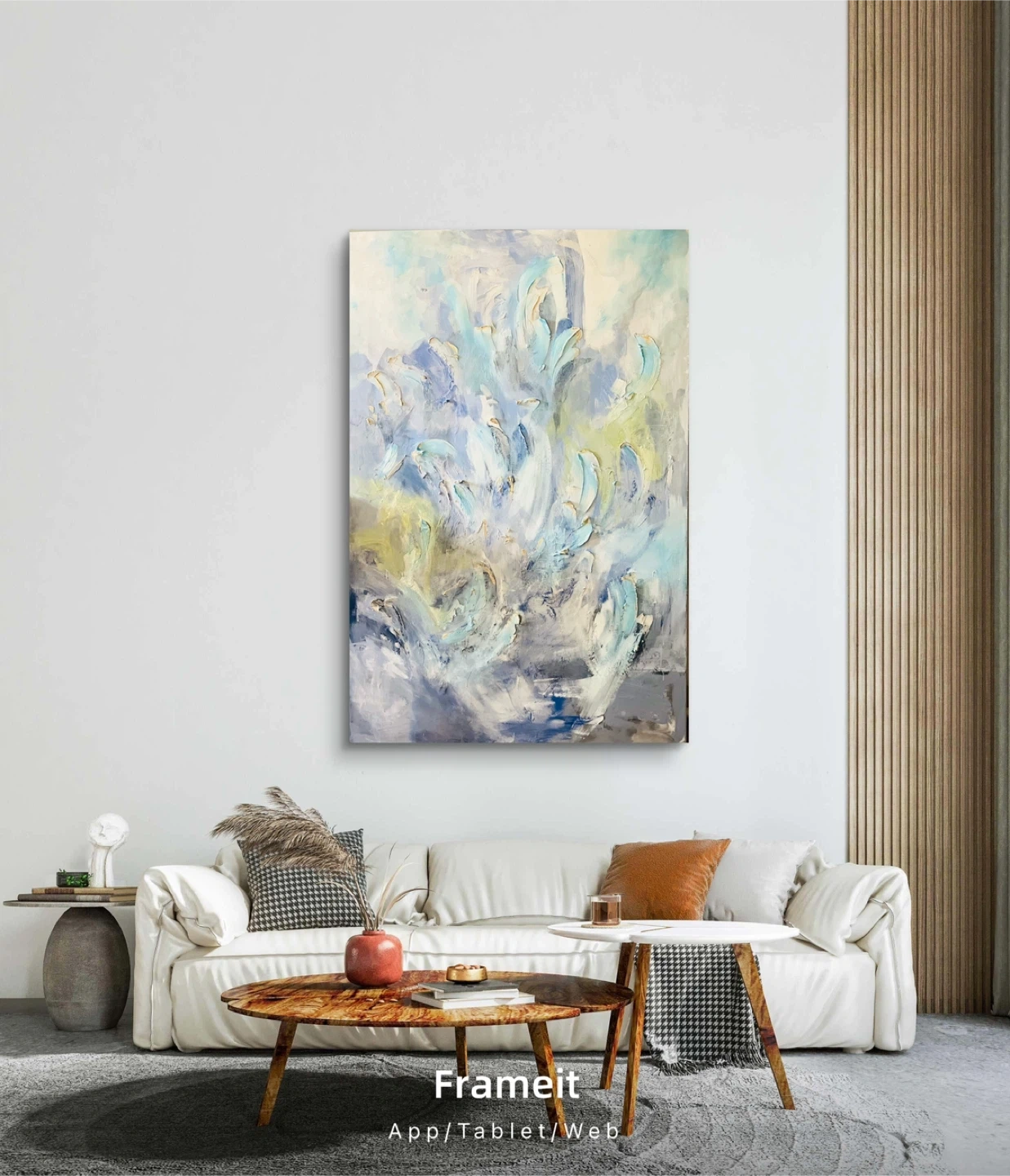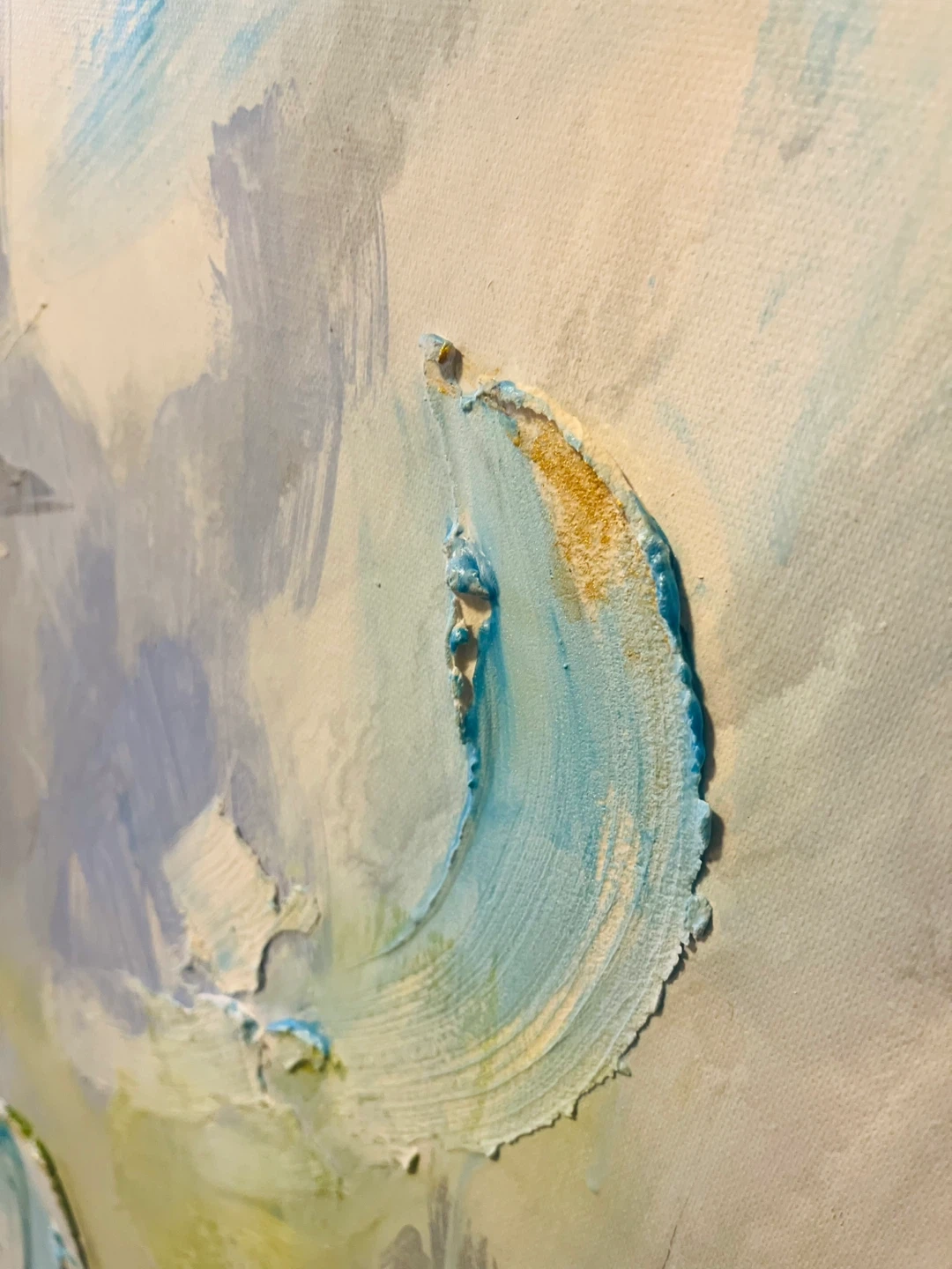 Beautiful abstract painting with textured brushstrokes in soothing blues, whites, and yellow hues. It's a statement piece for any living space. Canvas art. This is a real painting on canvas, signed on the back.