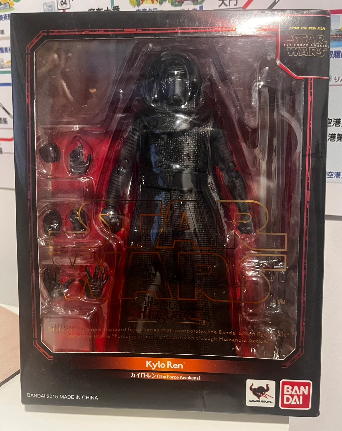Selling a Kylo Ren action figure from Star Wars: The Force Awakens! This is part of the S.H.Figuarts series by Bandai, known for its detailed and poseable figures. Made in China in 2015, it's a great collectible for any Star Wars fan!