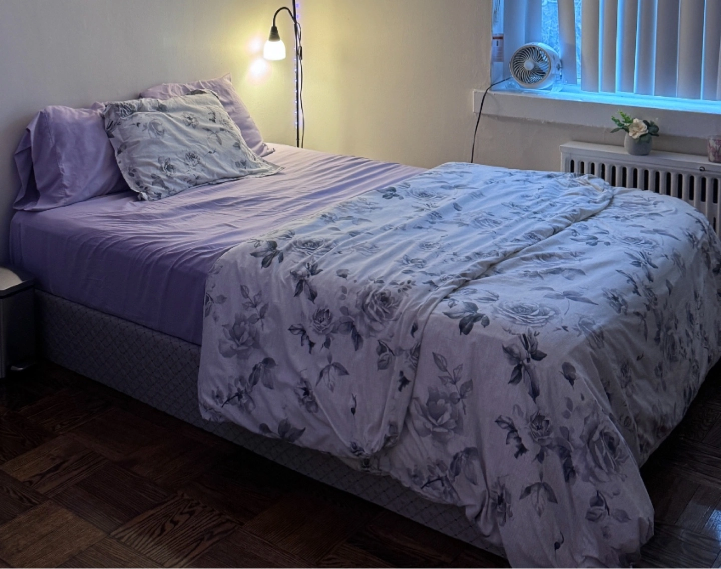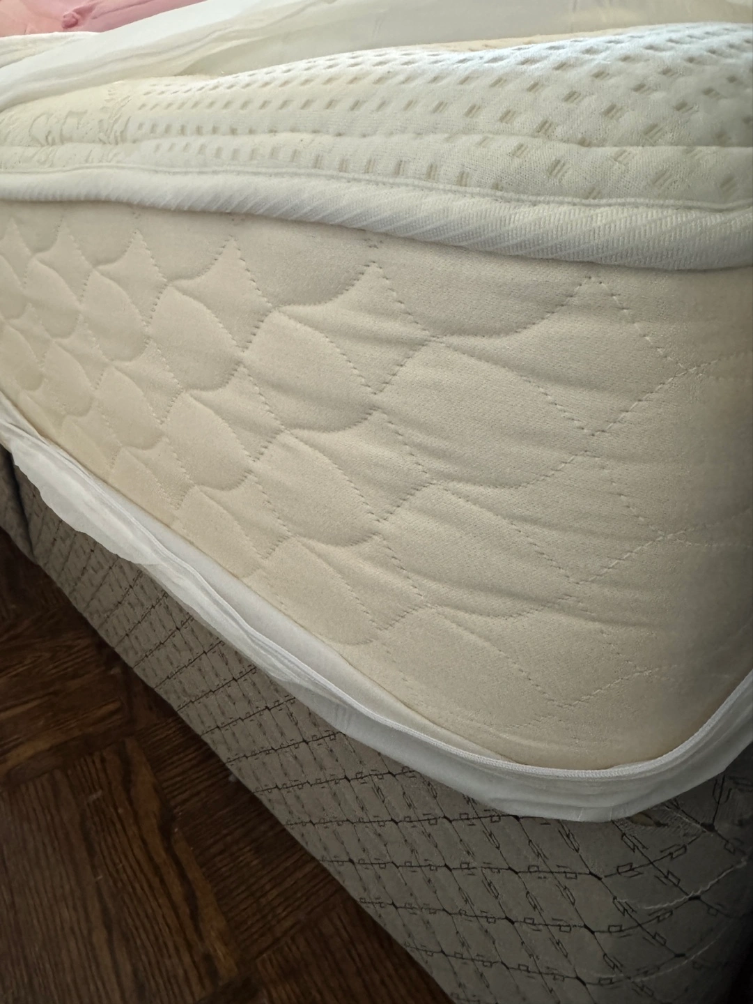 Comfortable queen-size mattress with box spring. Cream-coloured fabric. Used but in great shape. Sterns and fosters pillow top very comfortable. Memory foam.