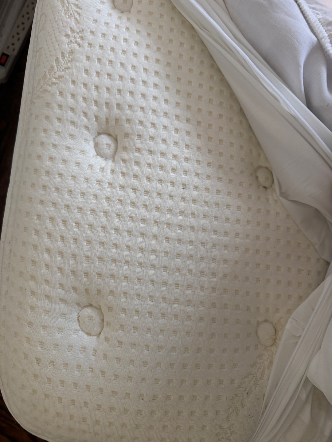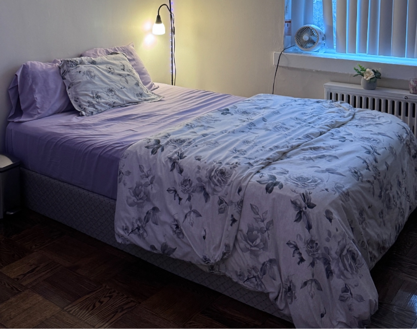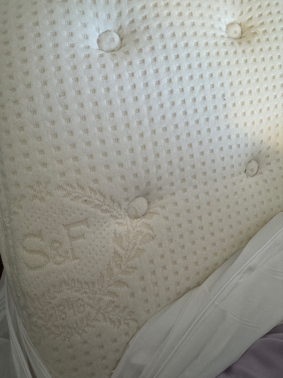 Comfortable queen-size mattress with box spring. Cream-coloured fabric. Used but in great shape. Sterns and fosters pillow top very comfortable. Memory foam.