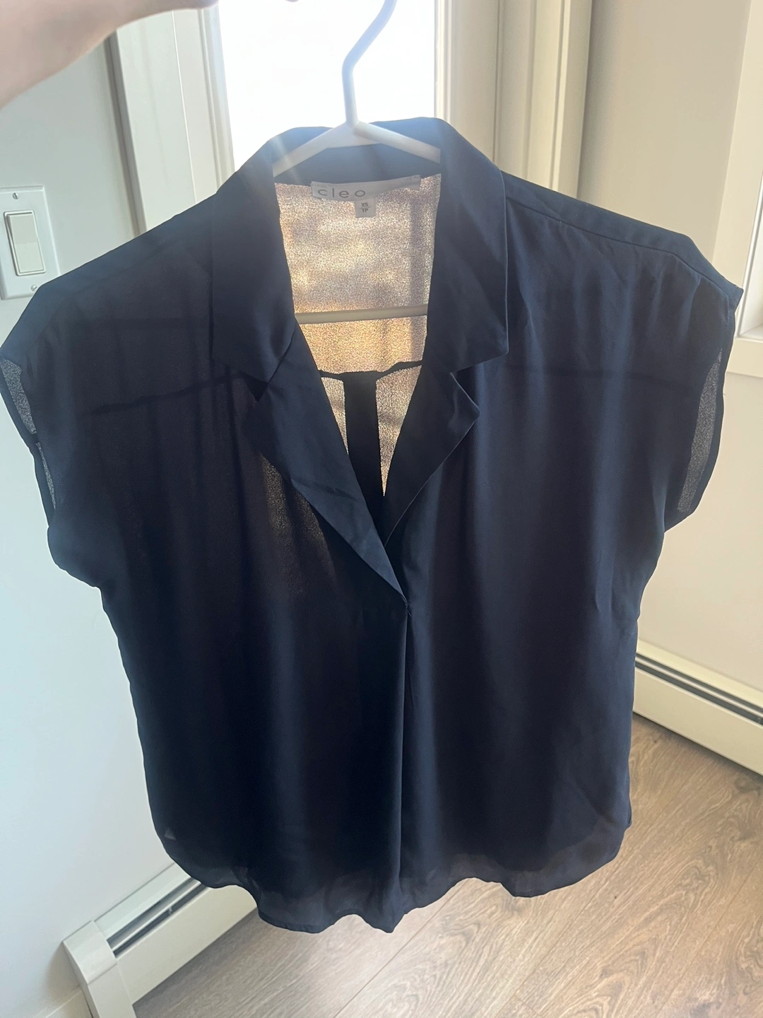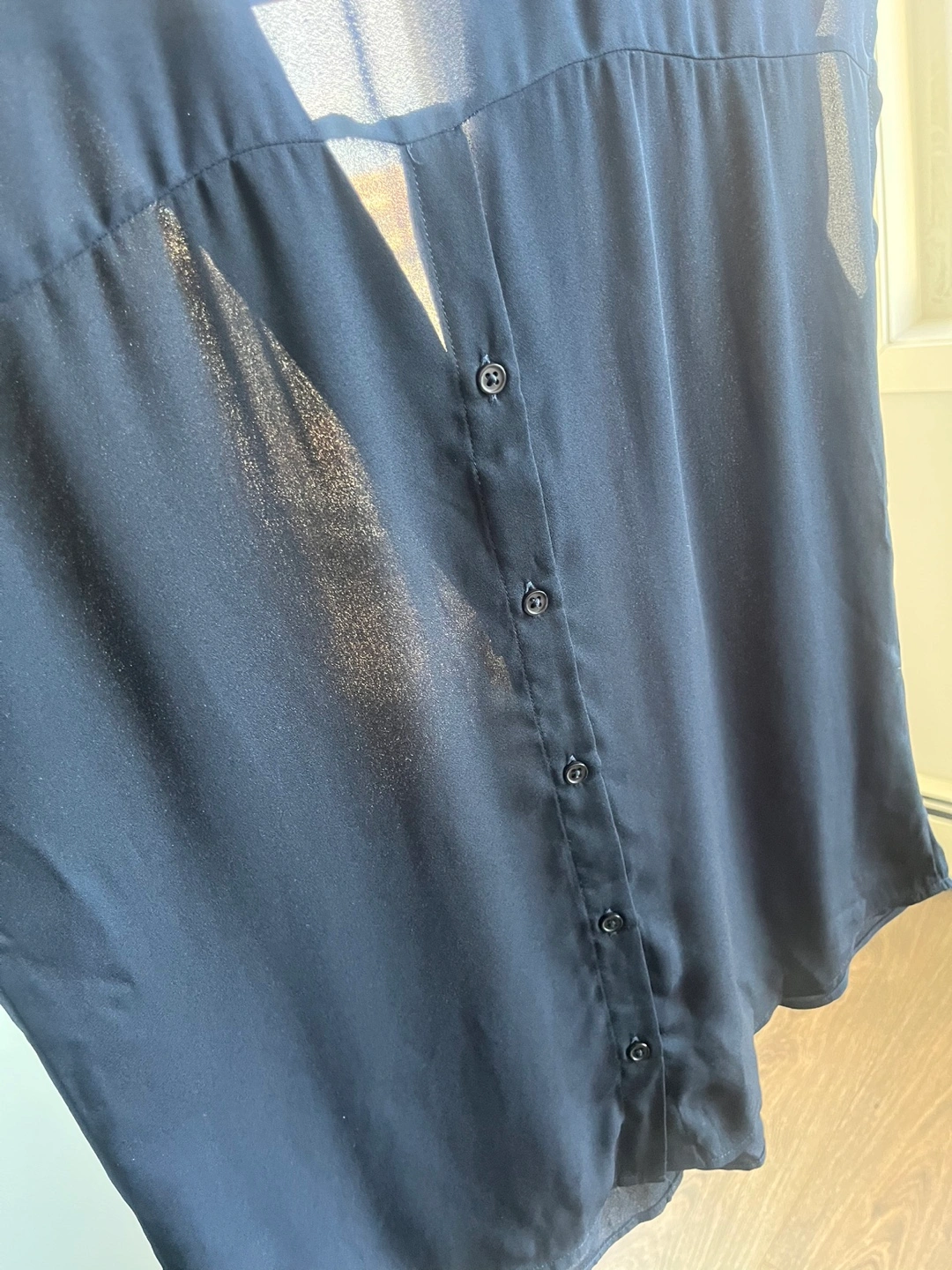 Sheer navy blouse. Size XS. Cute Button detail on back. Short sleeves. Collared. Business casual. Perfect for work. 100% polyester.
