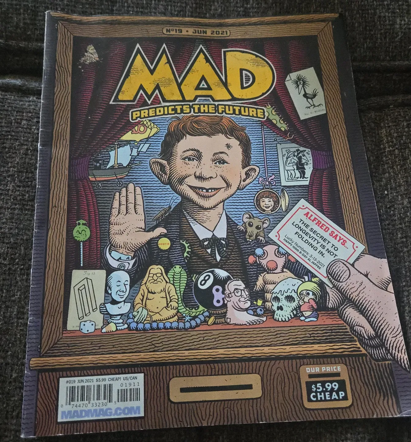 MAD Magazine issue #19, published in June 2021. This copy features 'Alfred Says... The Secret to Longevity is Not Folding In.' It's a great read for fans of satirical humour. Fun for collectors and readers!