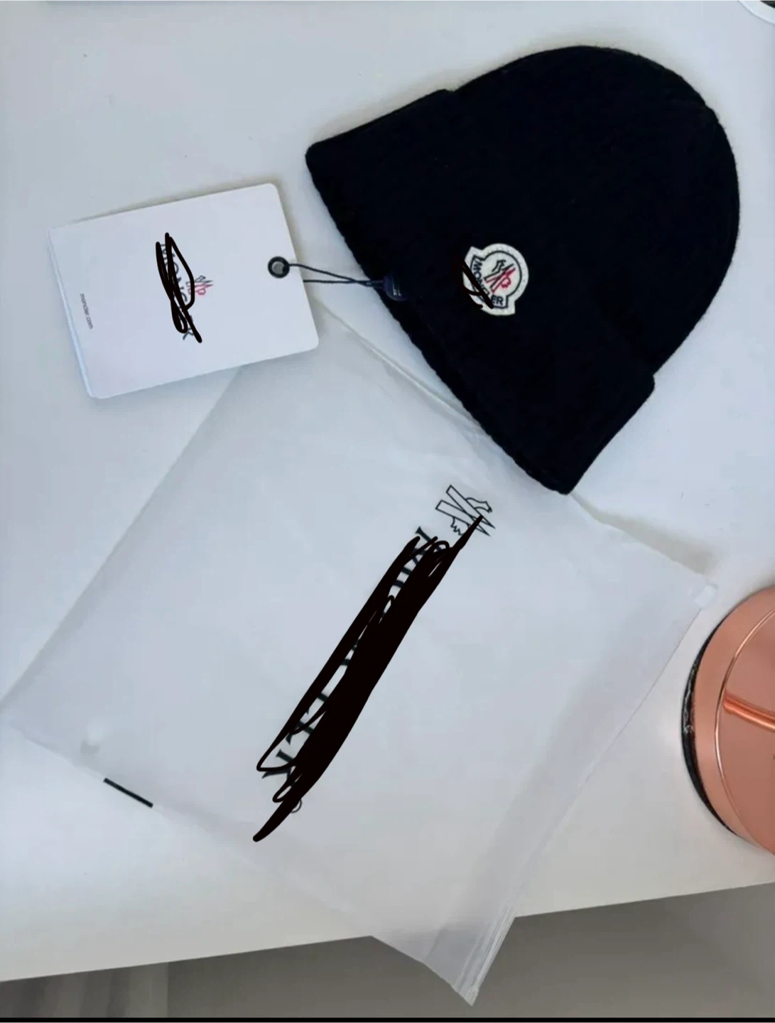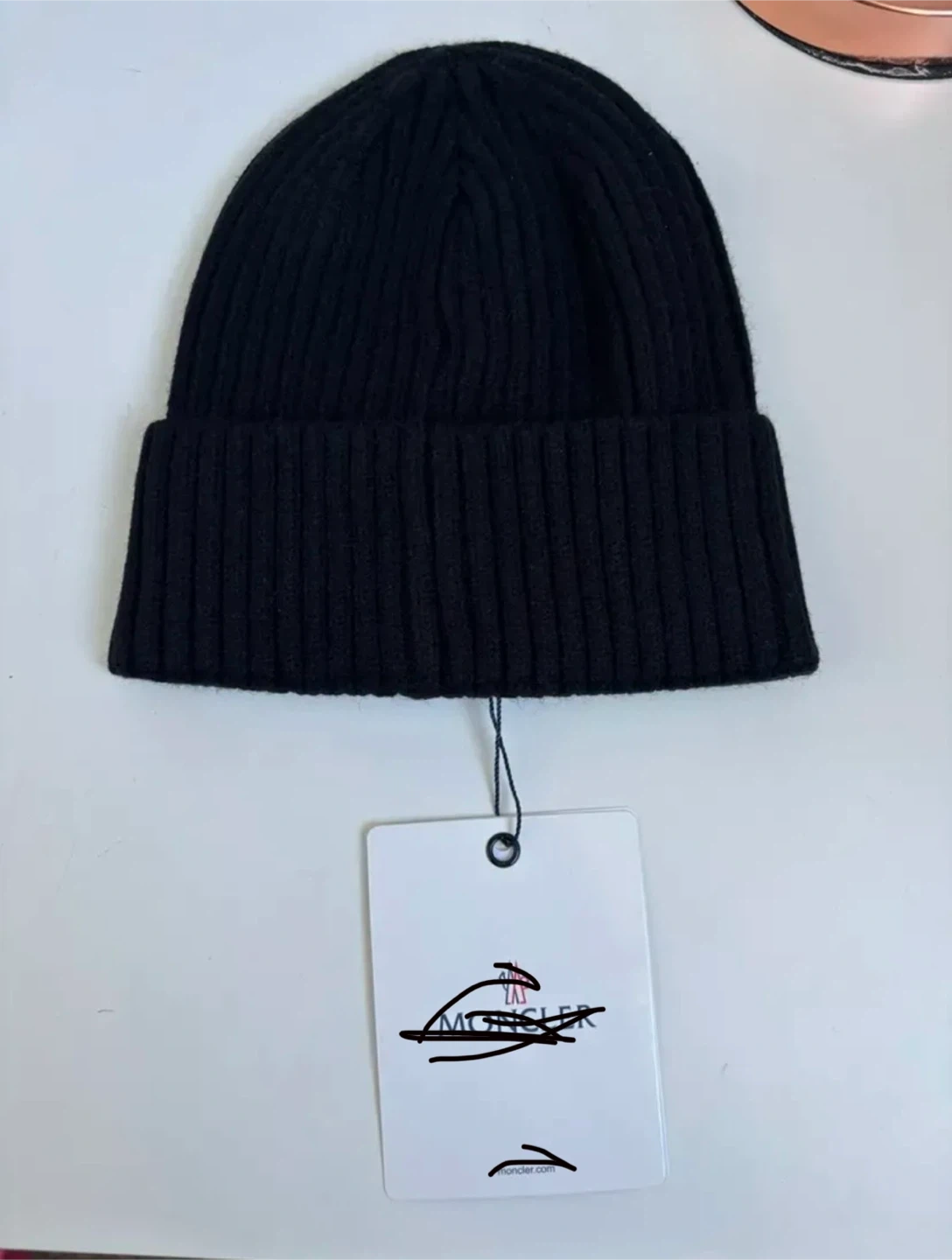 Selling a Moncler black beanie hat. It's in great condition and comes with the original tag and packaging