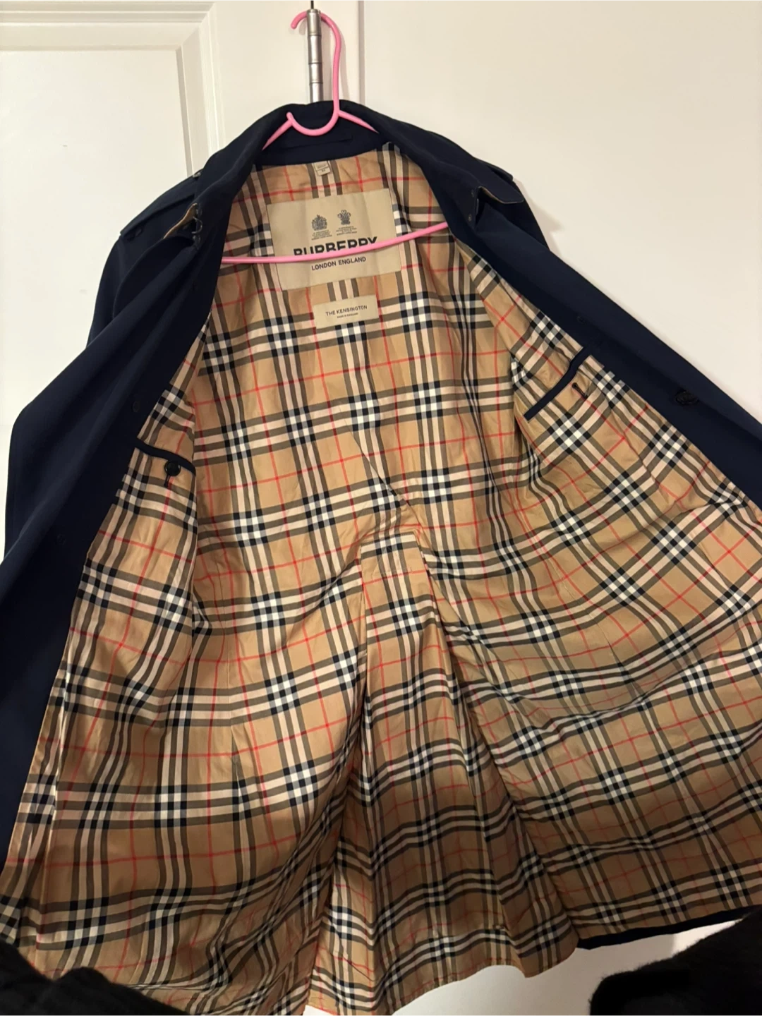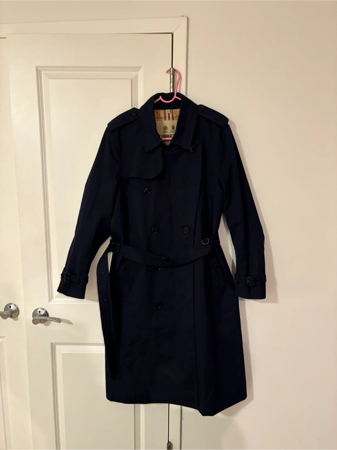Selling a Burberry London England trench coat in great condition! The coat is navy blue with the classic Burberry plaid lining. It's a timeless piece that will keep you stylish and warm
