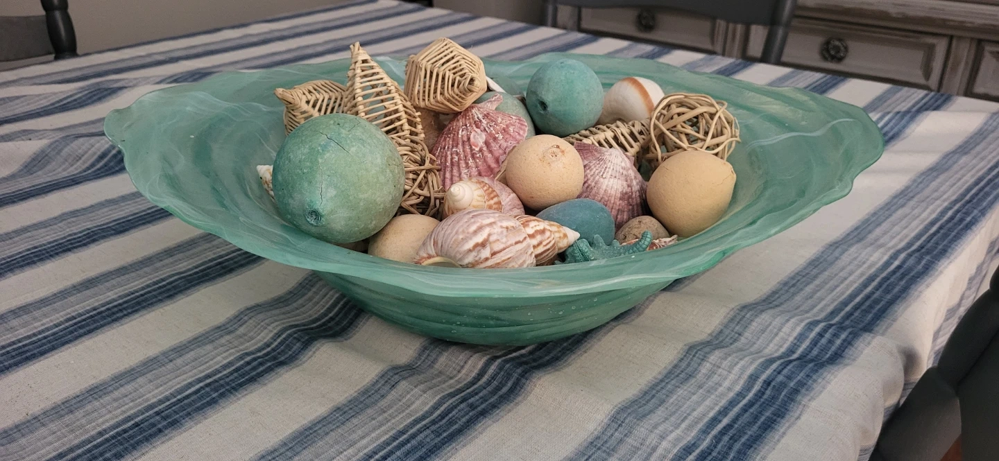 This decorative glass bowl is filled with a variety of seashells, including conch and scallop shells. It also contains several wicker orbs and smaller decorative spheres in aqua and tan colours. A lovely piece for coastal or beach-themed decor!