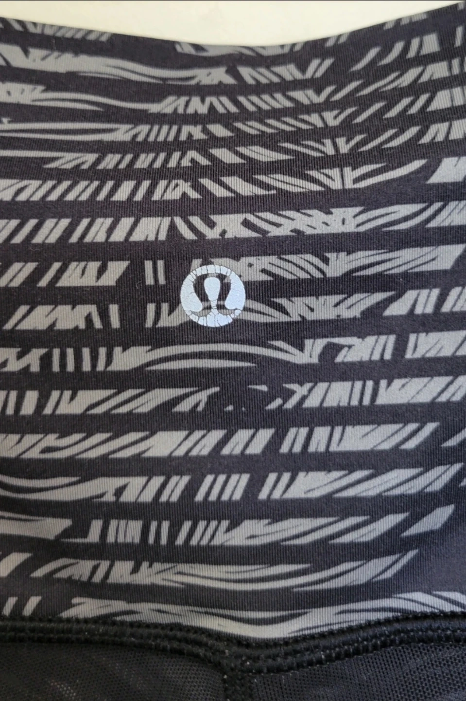 These Lululemon leggings are great for workouts or everyday wear. They feature a black and grey patterned waistband and side panels with sheer mesh accents. It's a comfortable and stylish addition to your active wardrobe!