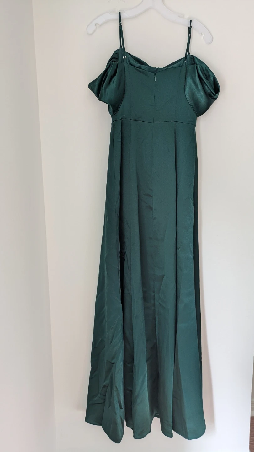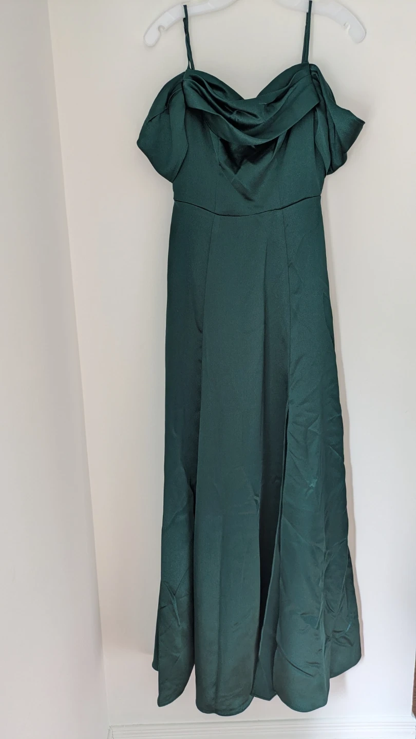 Selling an emerald green Luxe Charmeuse Off-the-Shoulder Dress by David's Bridal. It is perfect for prom, a wedding, or another formal occasion!