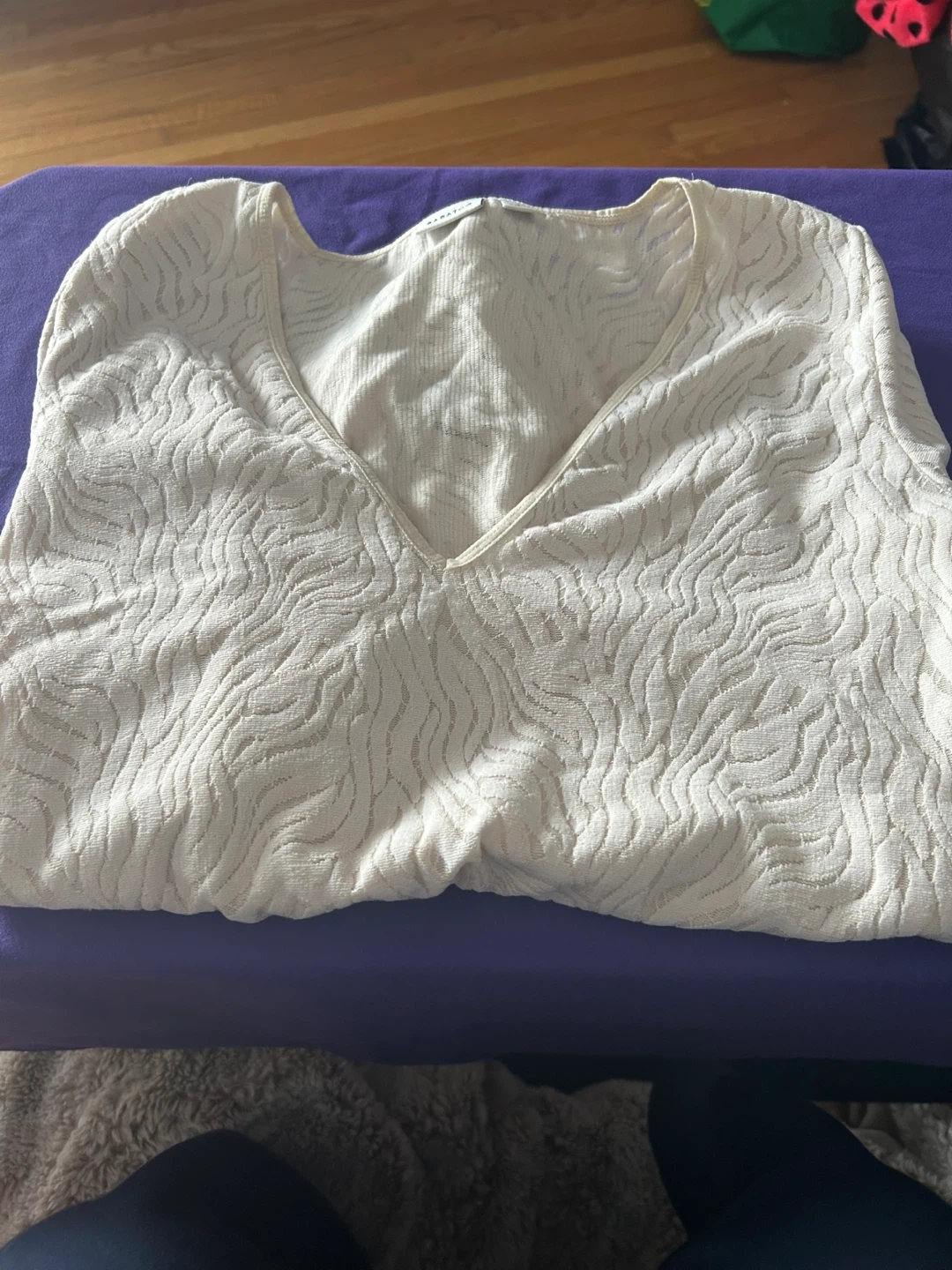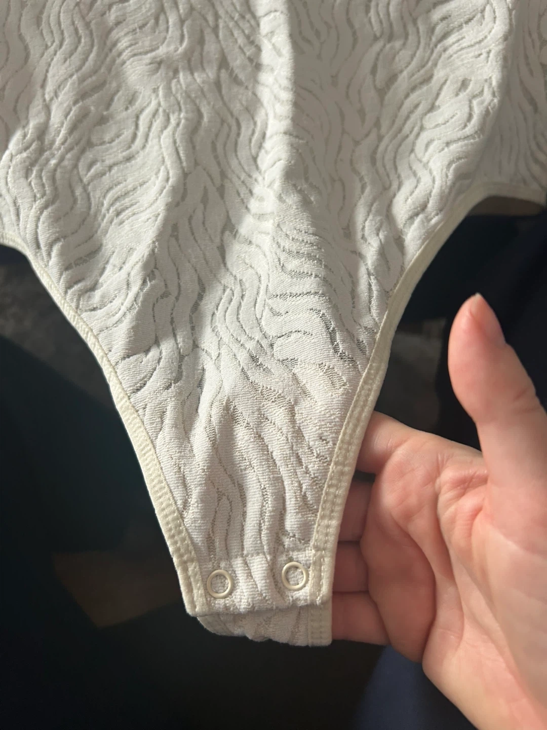 A cream-coloured Babaton bodysuit with a subtle wave-like textured pattern. It features a V-neck and a snap closure at the crotch. Made in Canada, size large.
