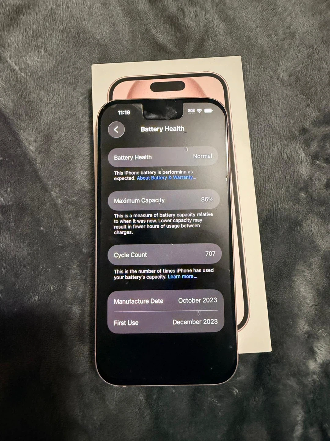 iPhone 15 in pink. Battery health is at 86% with a cycle count of 707. Manufactured in October 2023. Includes original box.