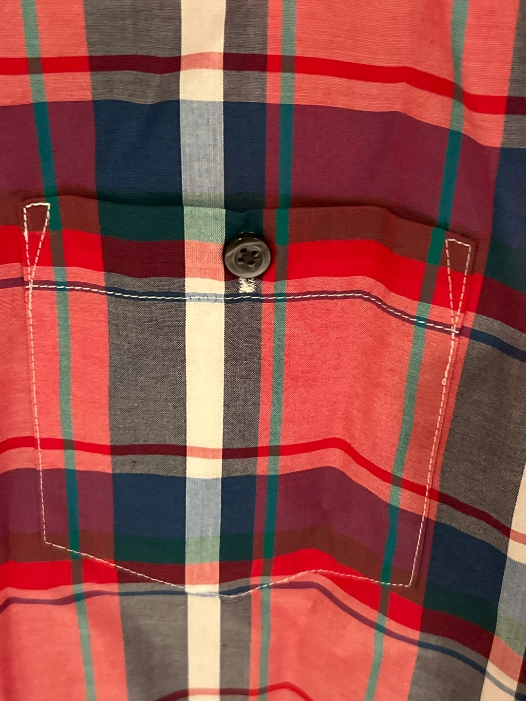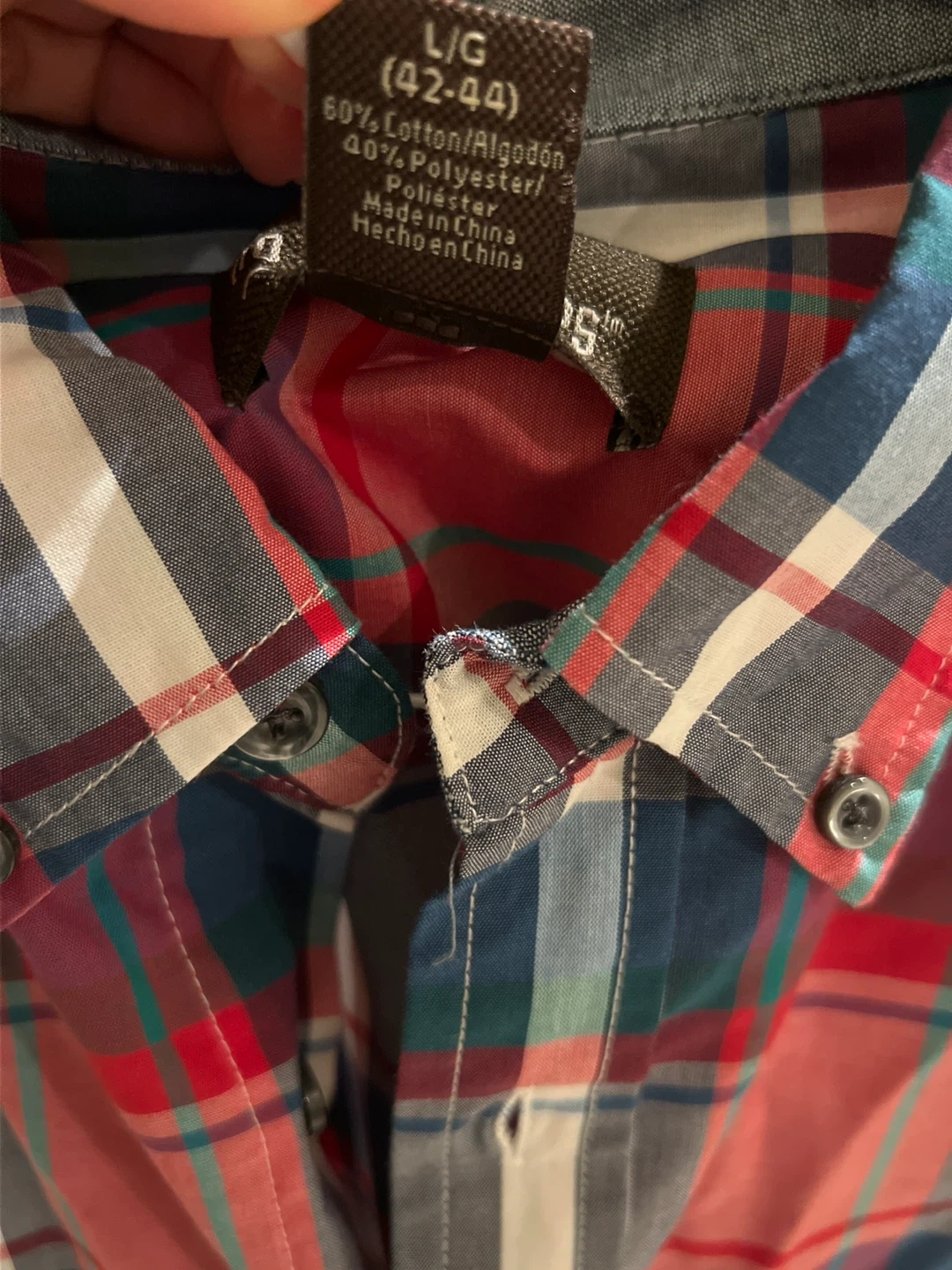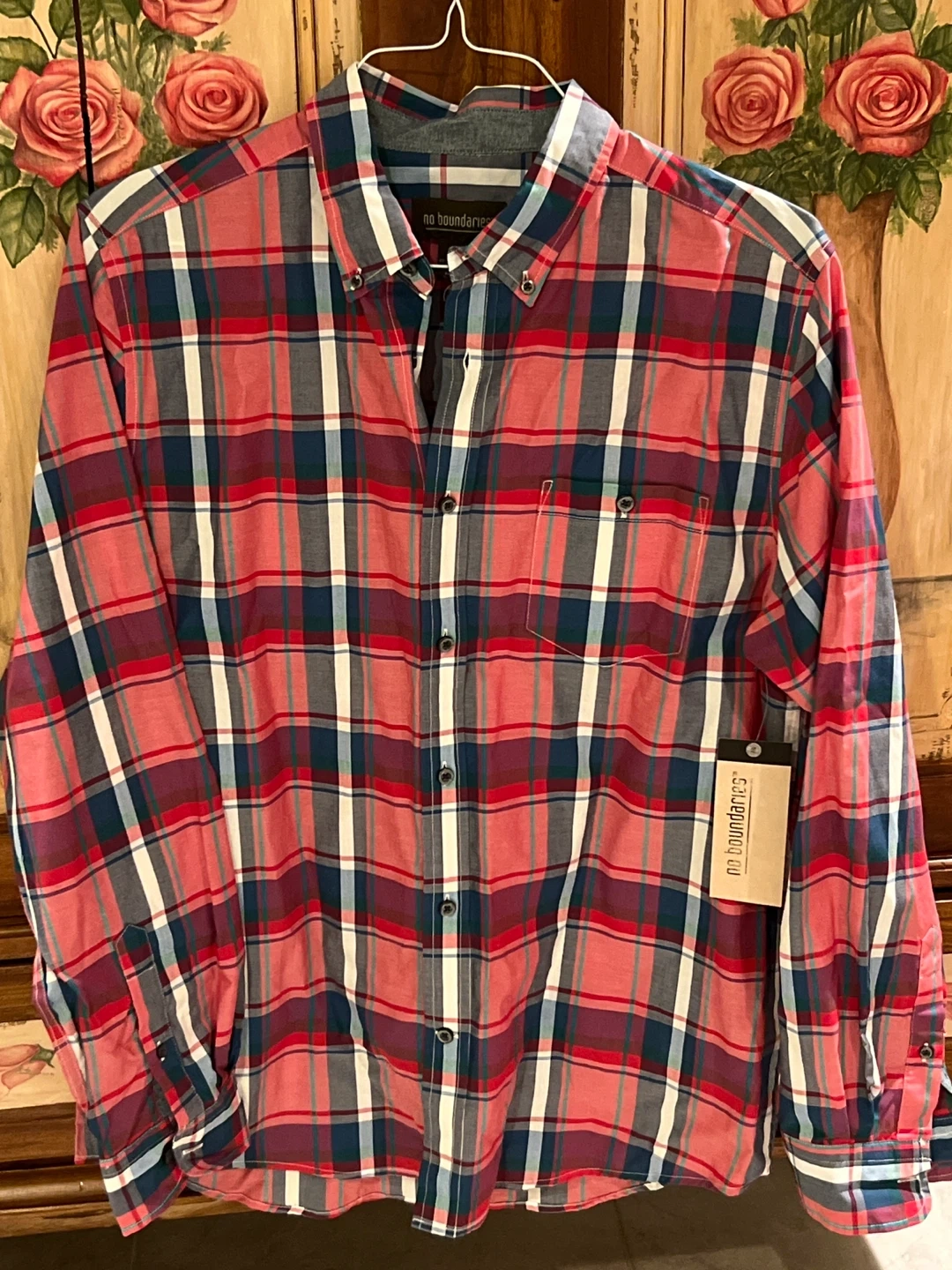 This men's long-sleeve button-down shirt from No Boundaries features a classic plaid pattern. It's made of 60% cotton and 40% polyester. The size is L/G (42-44).