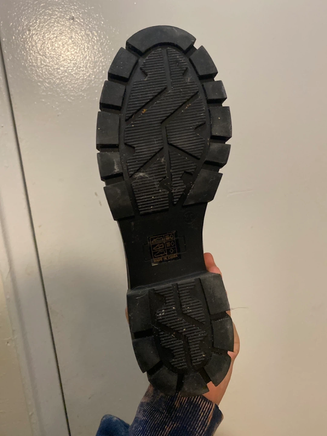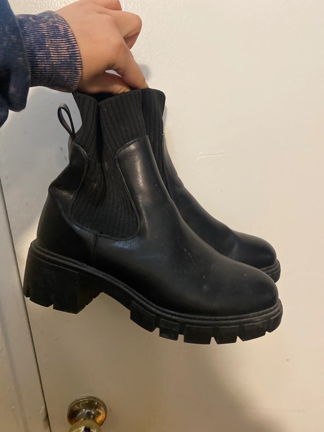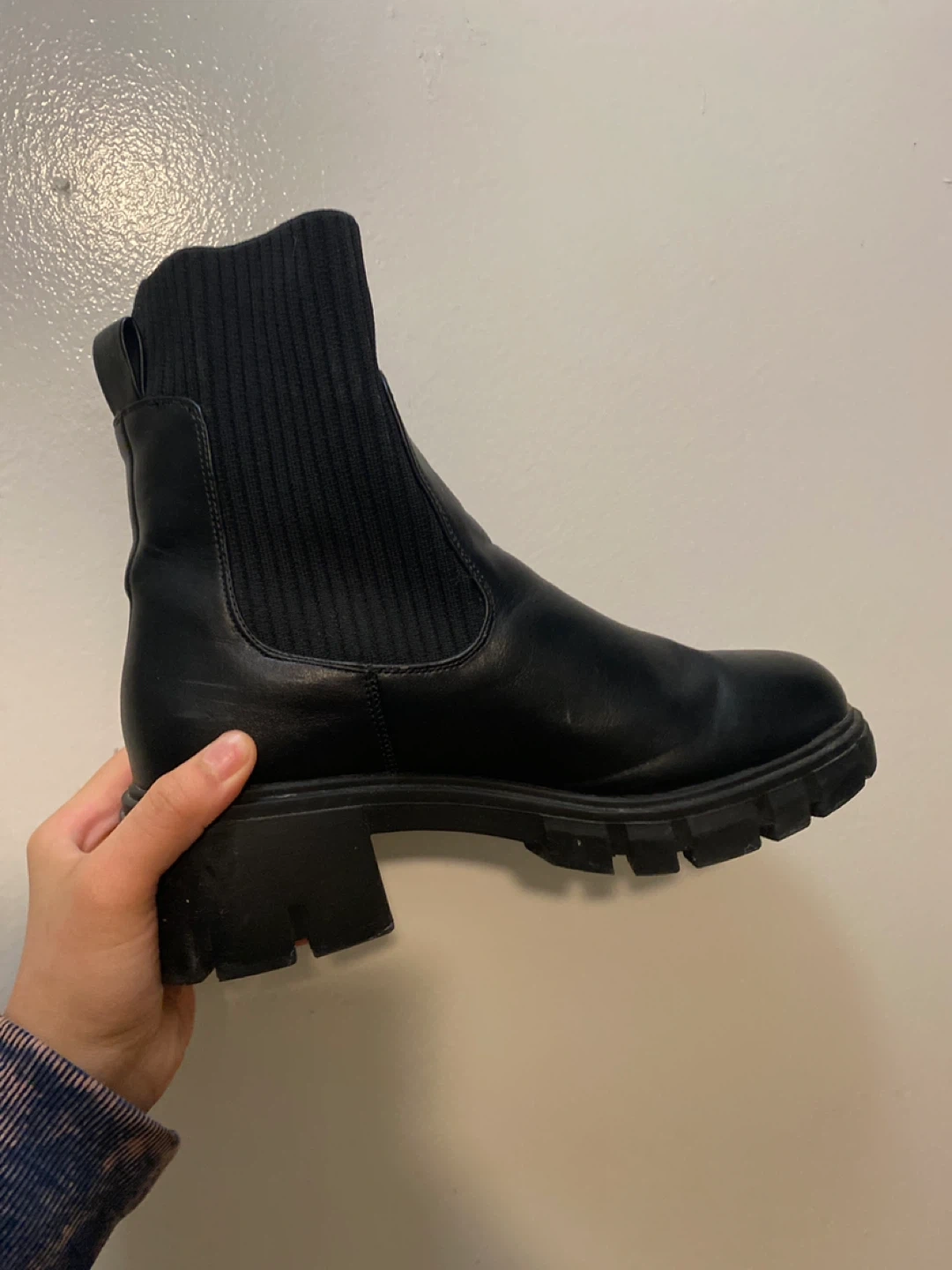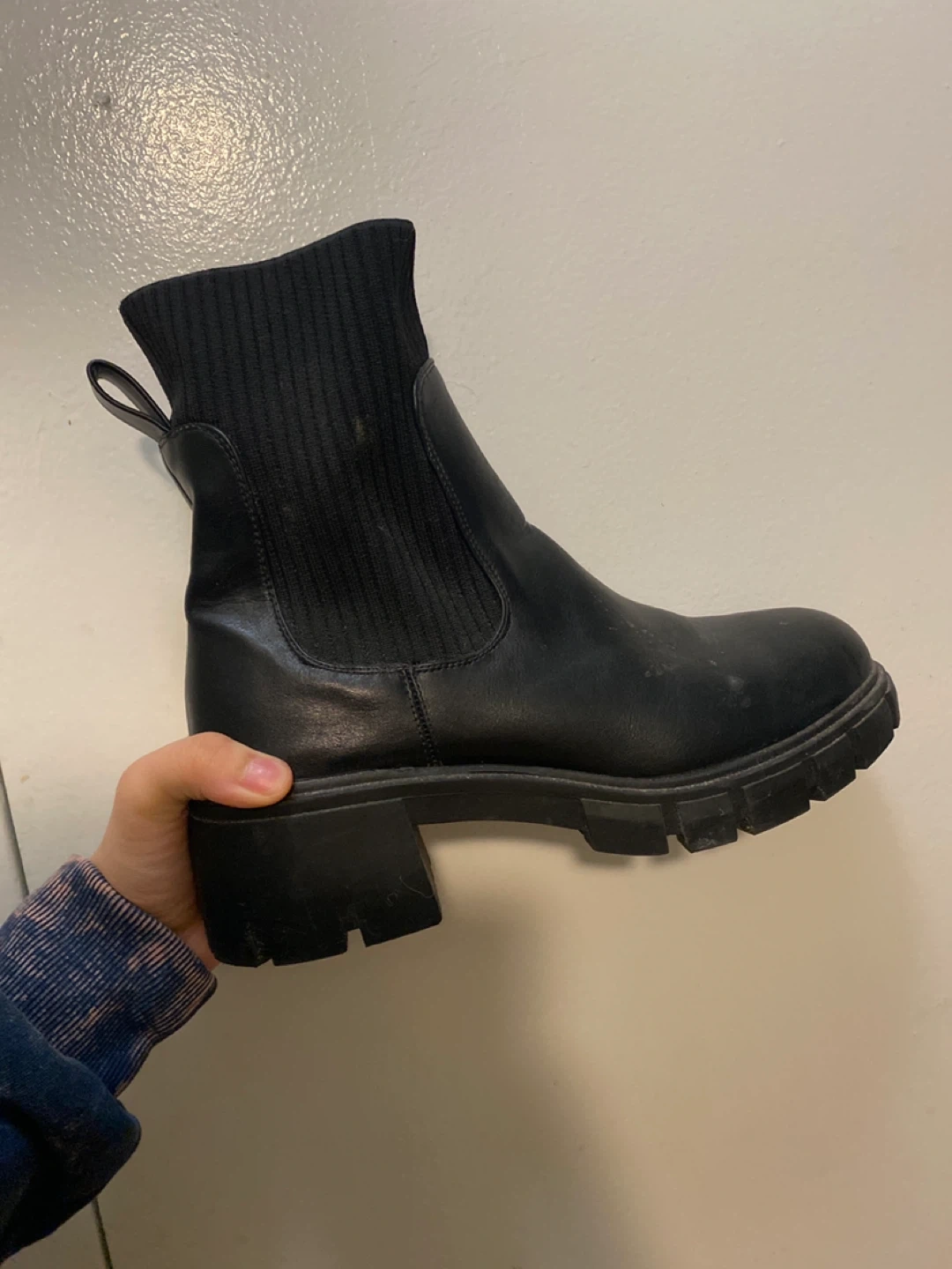 These black boots feature a chunky lug sole and a stretchy knit shaft. They have a classic Chelsea boot silhouette. Great for adding a bit of edge to your outfit!