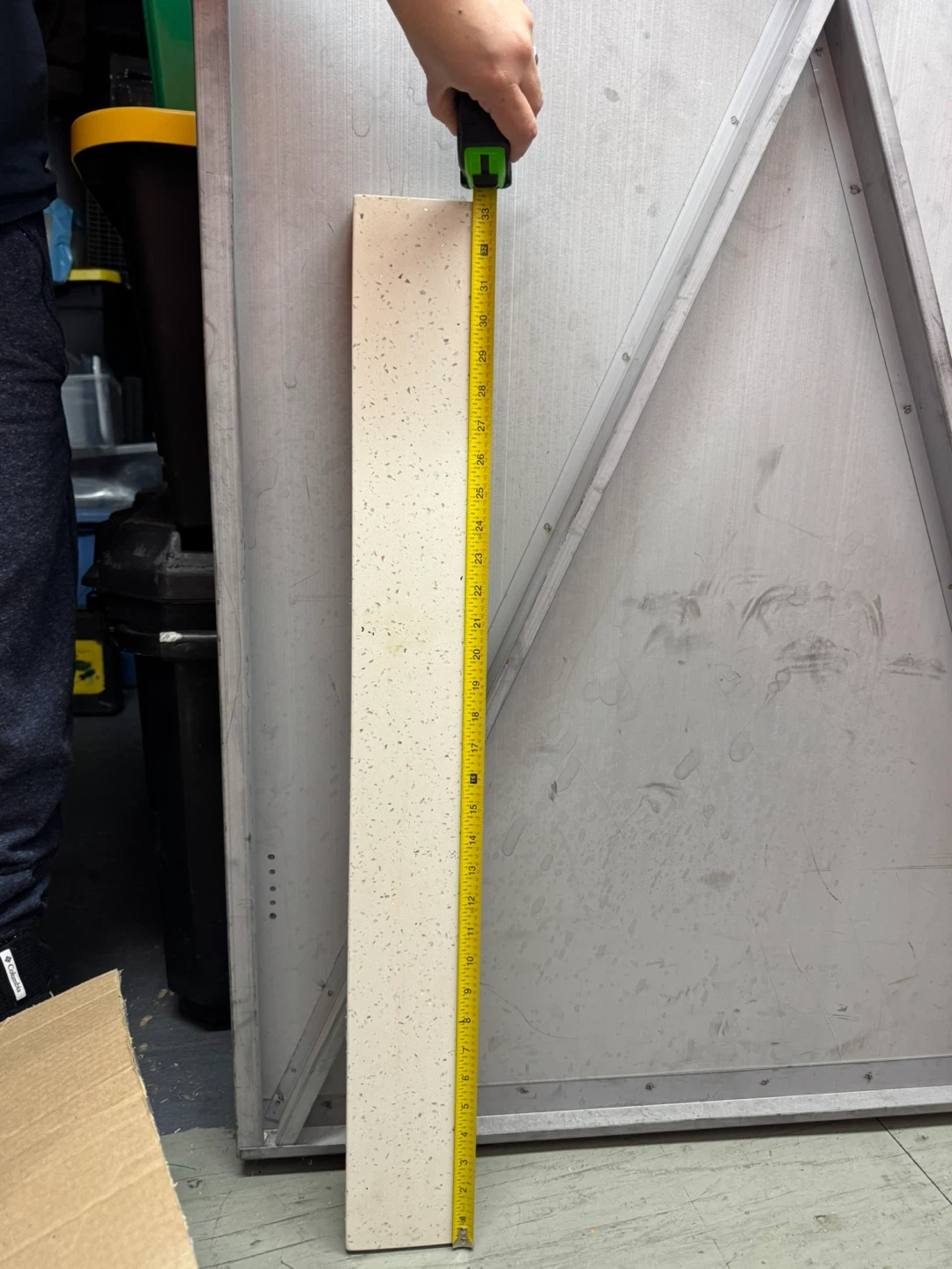 This is a sample piece of a white countertop with a speckled pattern. It measures approximately 33 inches long. The material appears to be solid surface or quartz.