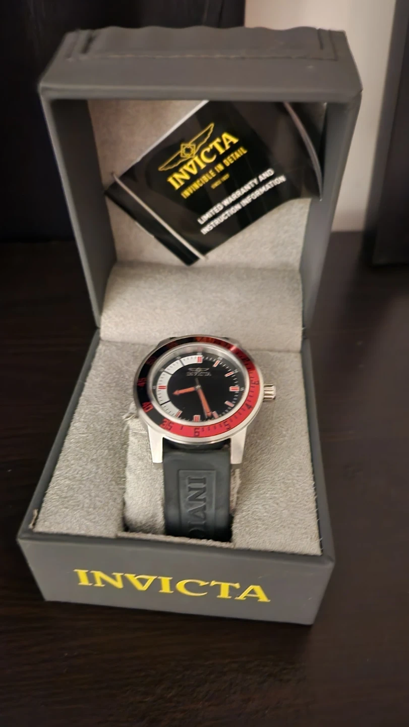 Invicta watch with a black dial and red bezel. It comes with a black rubber strap and the original box. Includes limited warranty and instruction information.
