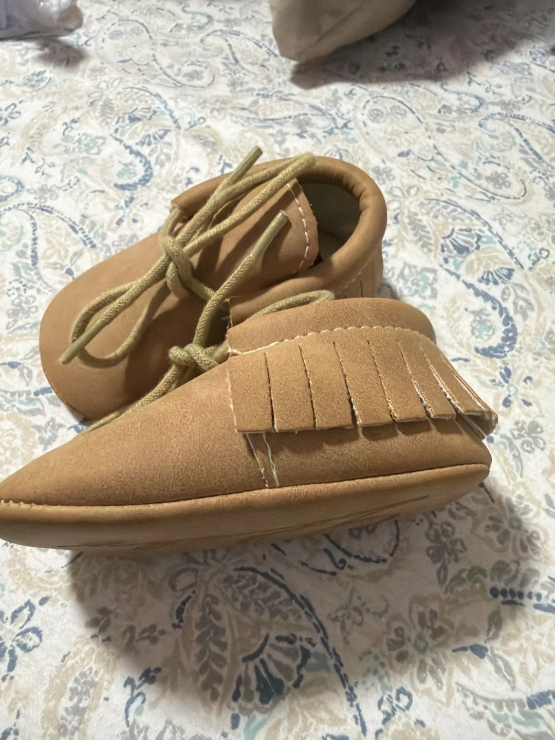 These adorable brown baby moccasins are in great condition! They have a cute fringe detail and tie closure. Perfect for keeping your little one's feet cozy and stylish