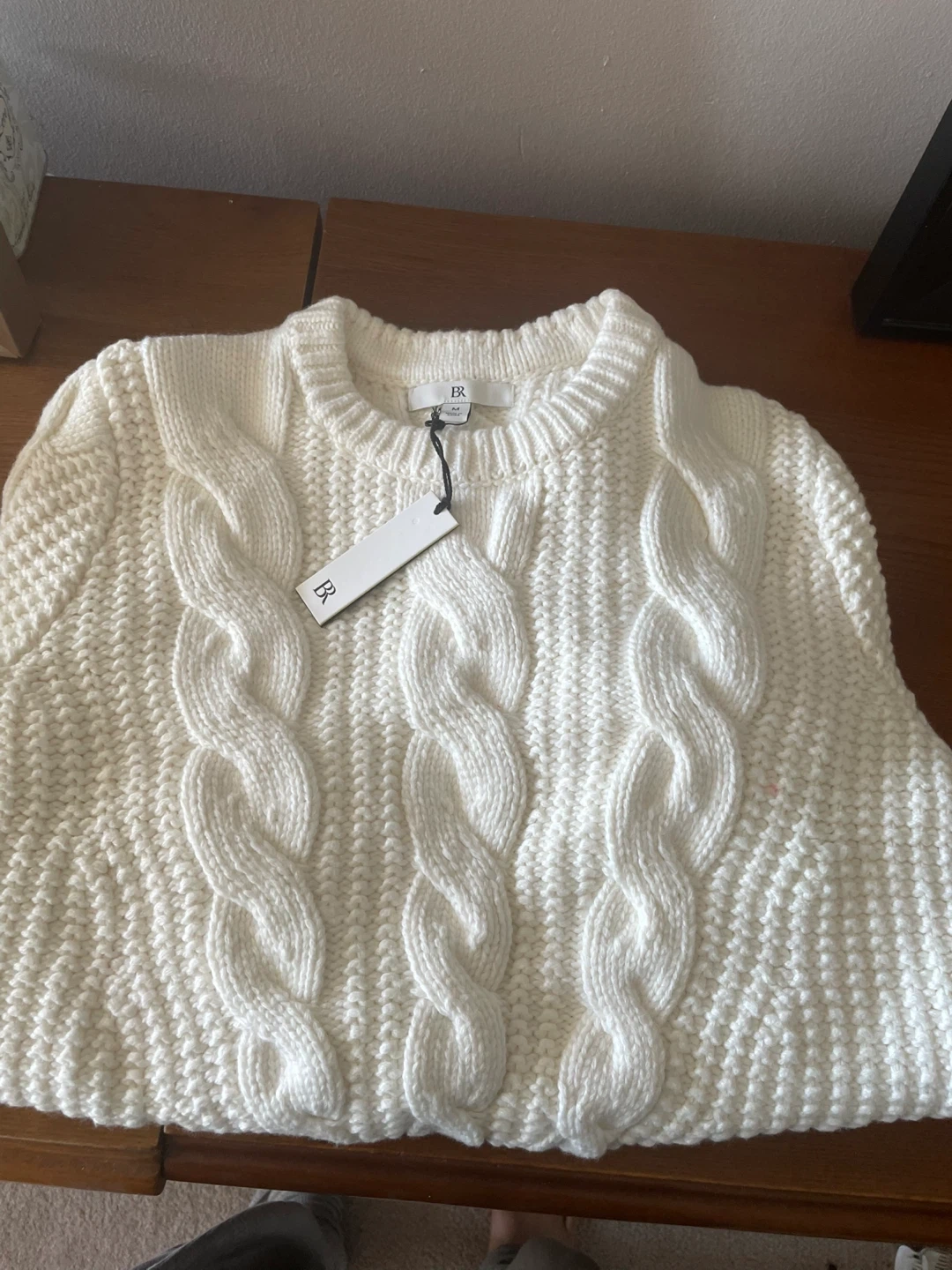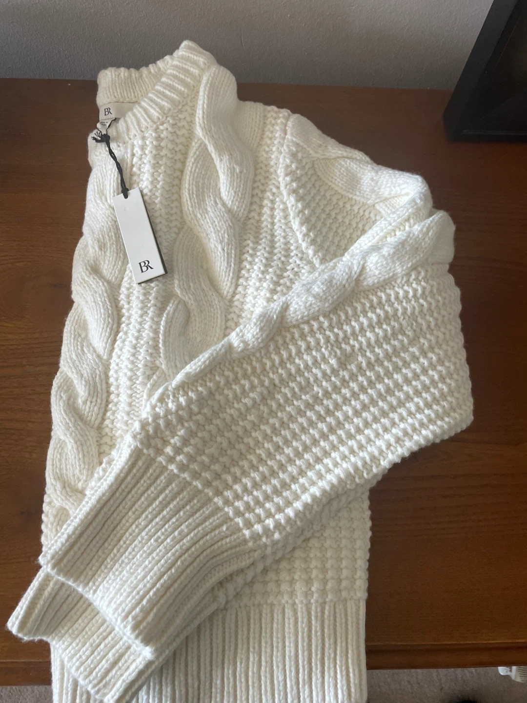 Banana Republic cream cable knit sweater. It's a cozy knit with a classic cable pattern. Perfect for layering when it's chilly out!