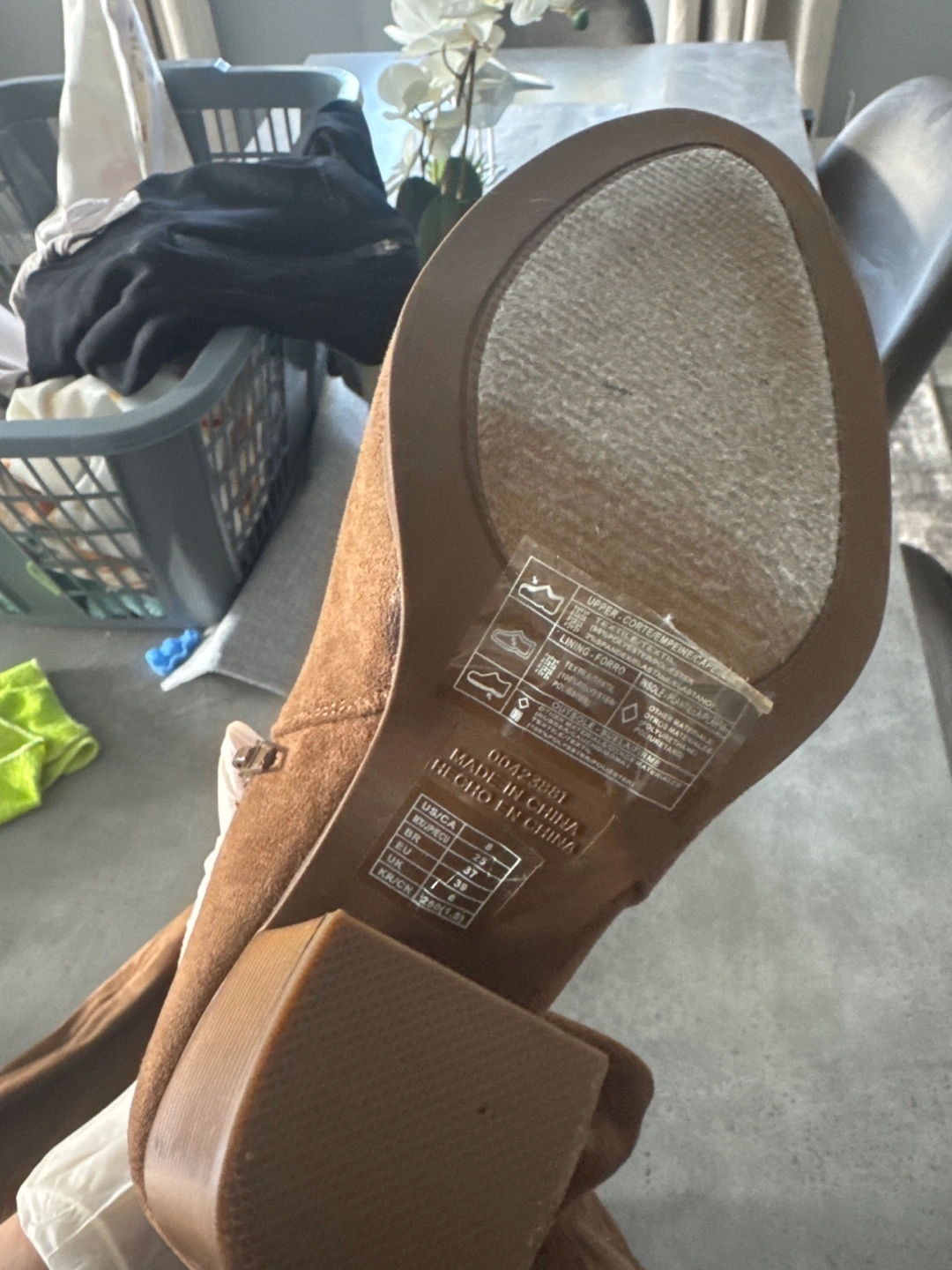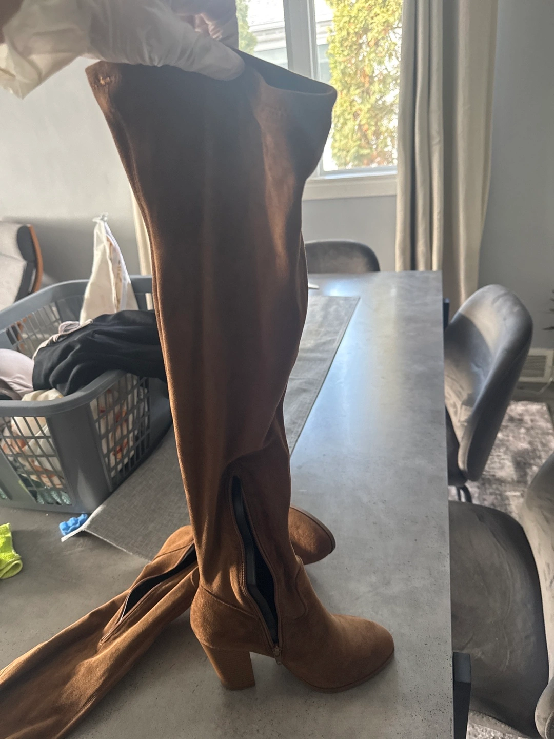 Women's brown suede over-the-knee boots. Block heel. Side zipper. Size 7. Made in China.
