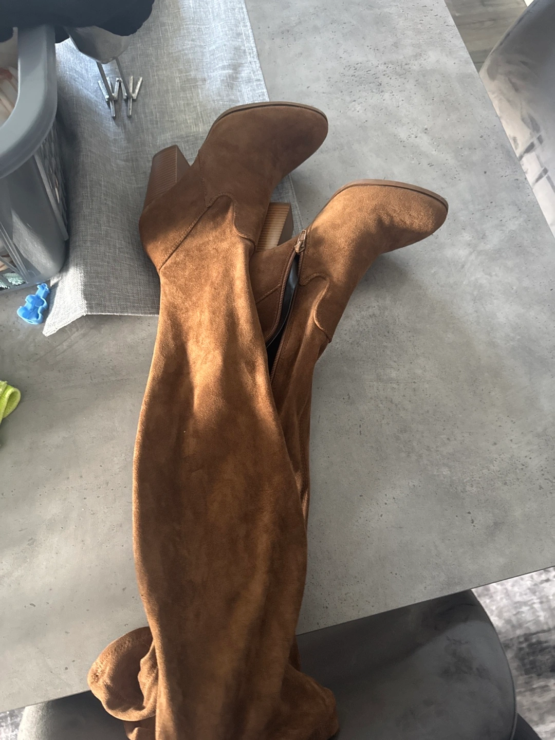 Women's brown suede over-the-knee boots. Block heel. Side zipper. Size 7. Made in China.