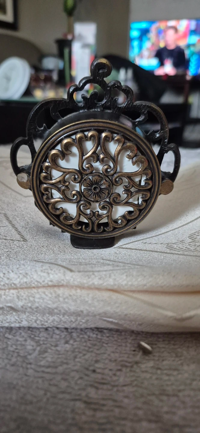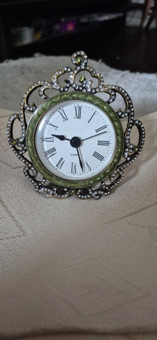 Here's a lovely decorative quartz table clock! It has a unique design with a green and gold colour stone scheme. The clock face features Roman numerals. It would be a pretty great addition to any room!