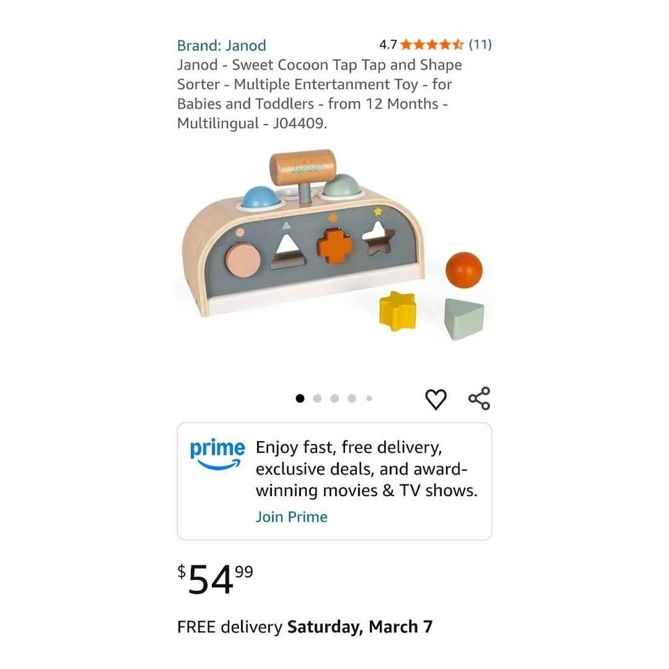 Excellent condition Janod Sweet Cocoon Tap Tap & Shape Sorter — a gorgeous high-quality wooden developmental toy. This is a premium 3-in-1 activity toy featuring a pounding bench with 3 colored wooden balls, a shape sorter with 4 distinct shapes, and a soft neutral “Sweet Cocoon” color palette. Designed for early-years development, this toy helps toddlers build fine motor skills, hand-eye coordination, dexterity, and problem-solving skills. Crafted from FSC-certified wood with smooth rounded edges and a modern Scandinavian-inspired design. Suitable for ages 12 months+. Retail price was $54.99 + tax. Selling for a fraction of retail! This is not a big-box plastic toy — Janod is a premium European brand known for beautiful, heirloom-quality wooden toys. Clean and ready for its next little learner. Pickup options: Etobicoke – Dundas & Royal York, Mississauga – QEW & Mississauga Rd, North York – Bathurst & Sheppard West, Downtown Toronto – occasional Union Station pickup. Porch pickup available. Bundle with my other Montessori baby toys to save.