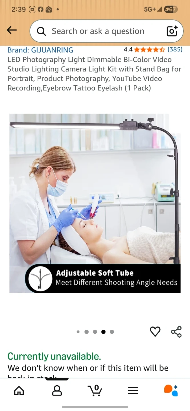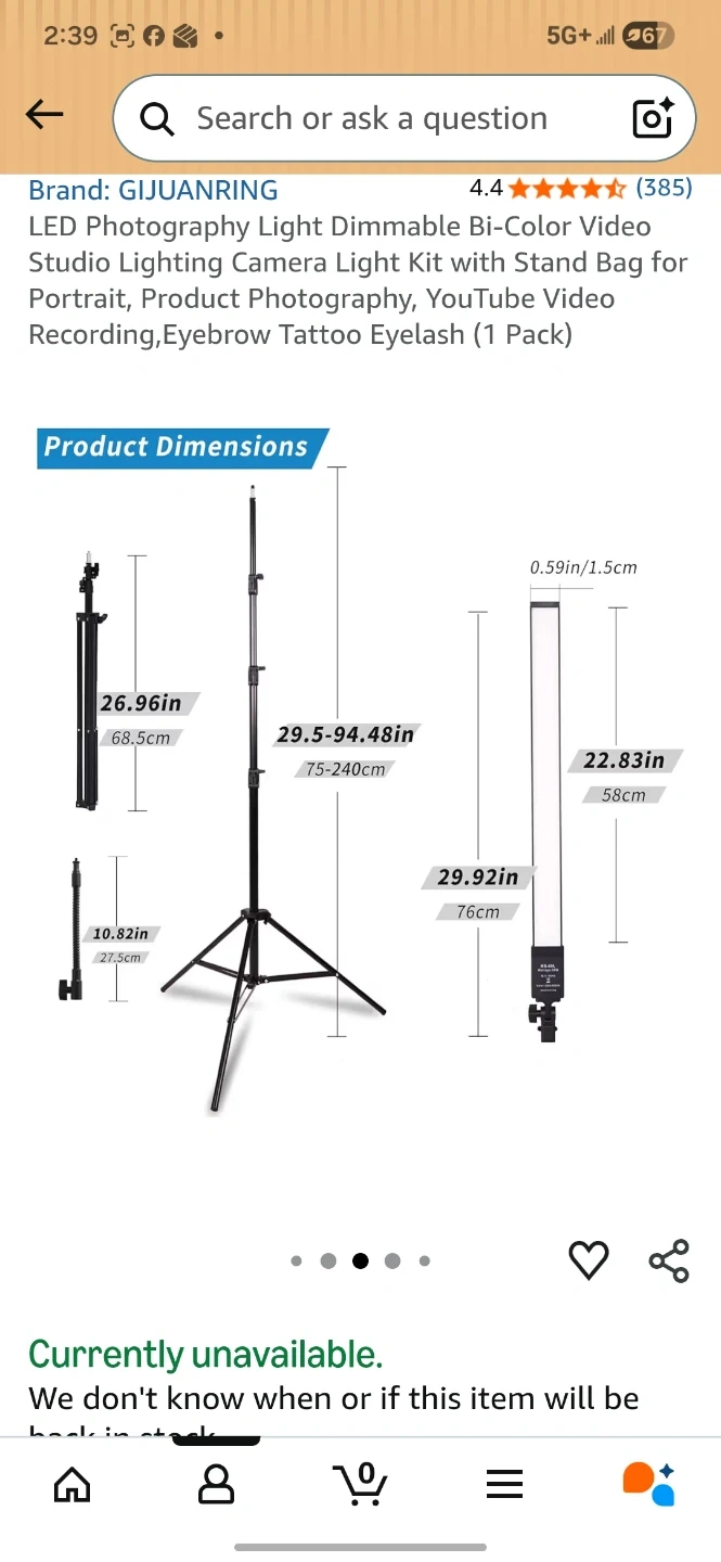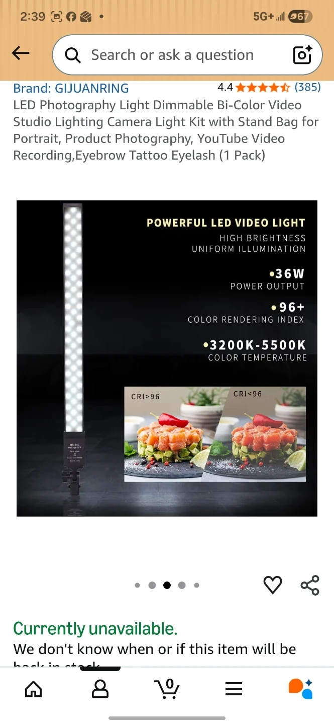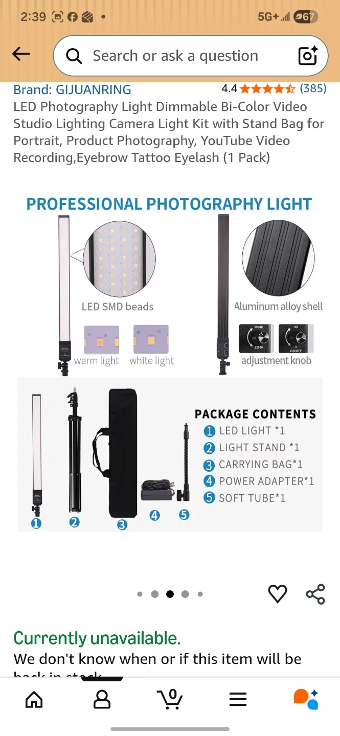 This is a photography light kit. It's bi-color and dimmable with adjustable brightness and colour temperature from 3200K to 5500K. The kit includes a light stand and a carrying bag. Power output is 36W and it has a CRI of >96.