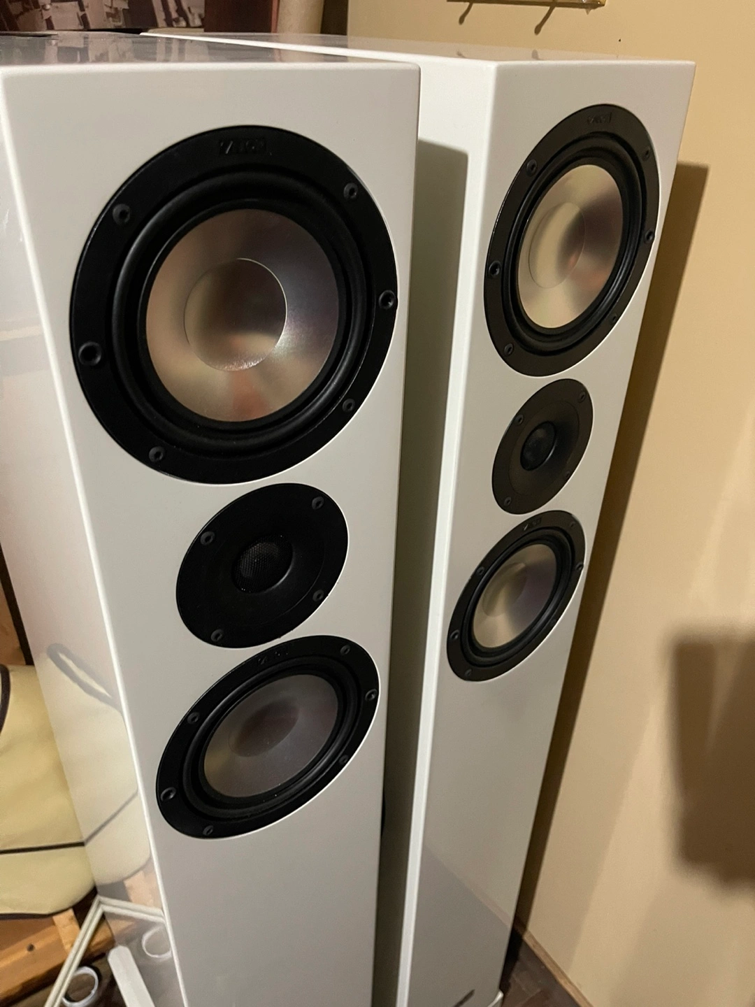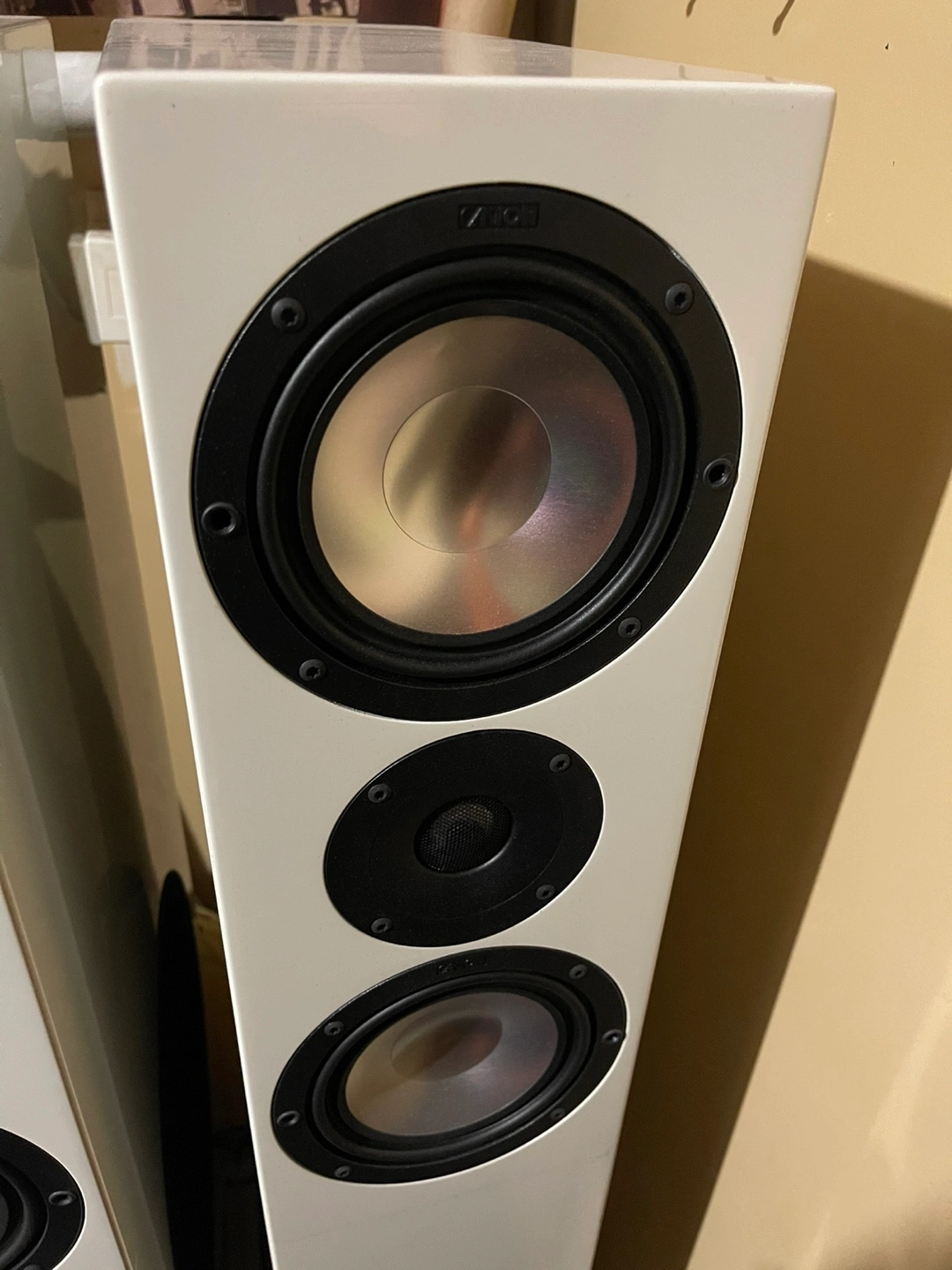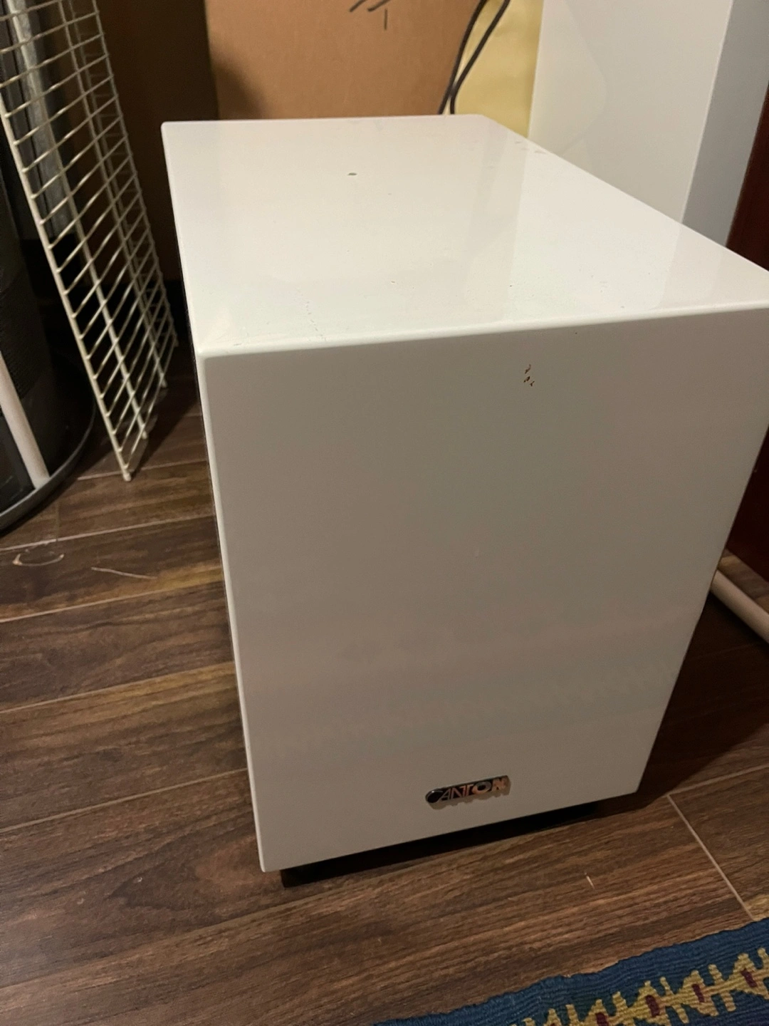 Pair of white Canton Reference 800.2 floorstanding speakers. Includes matching Canton subwoofer. Great sound quality. Minor cosmetic imperfections.