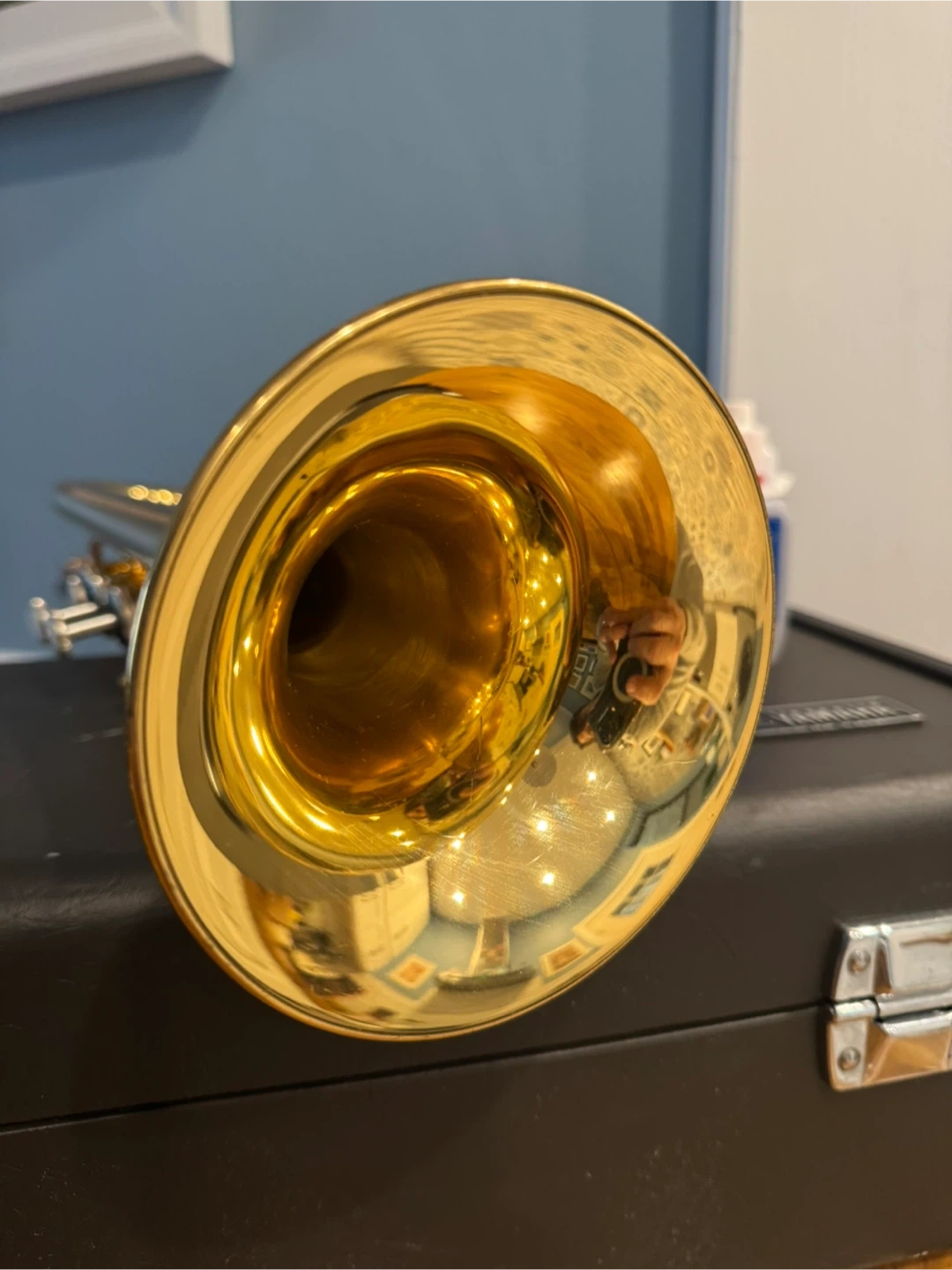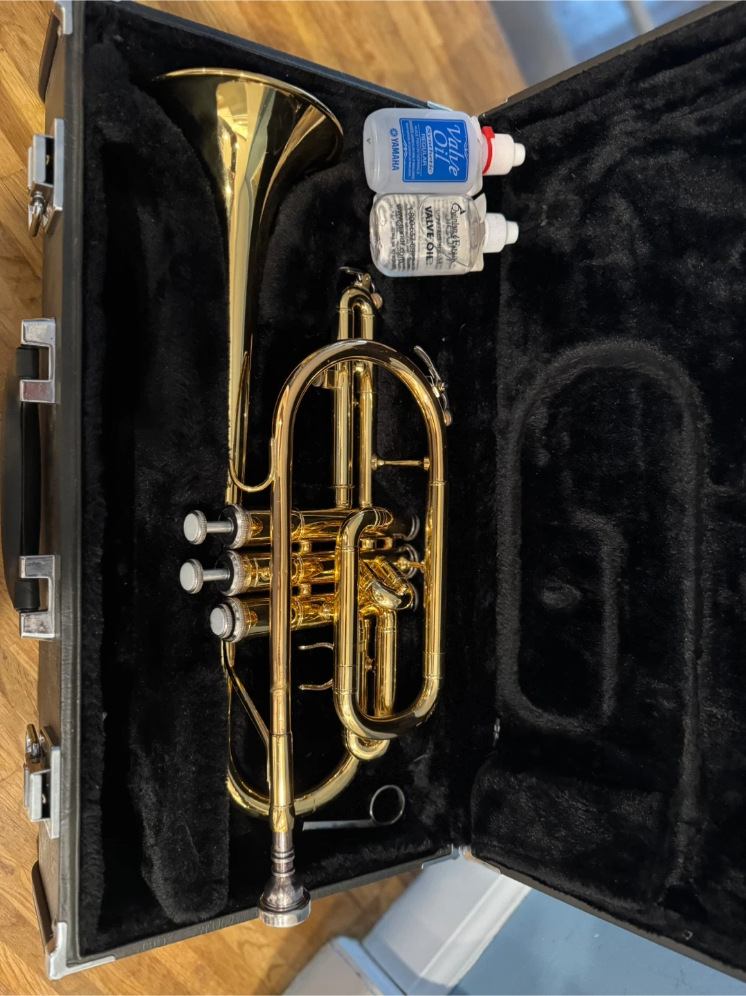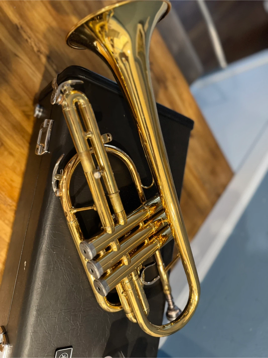 This is a gold-colored Yamaha cornet in amazing condition. It comes with its original hard case and two small bottles of valve oil. It has one valve stuck that requires lubrication.