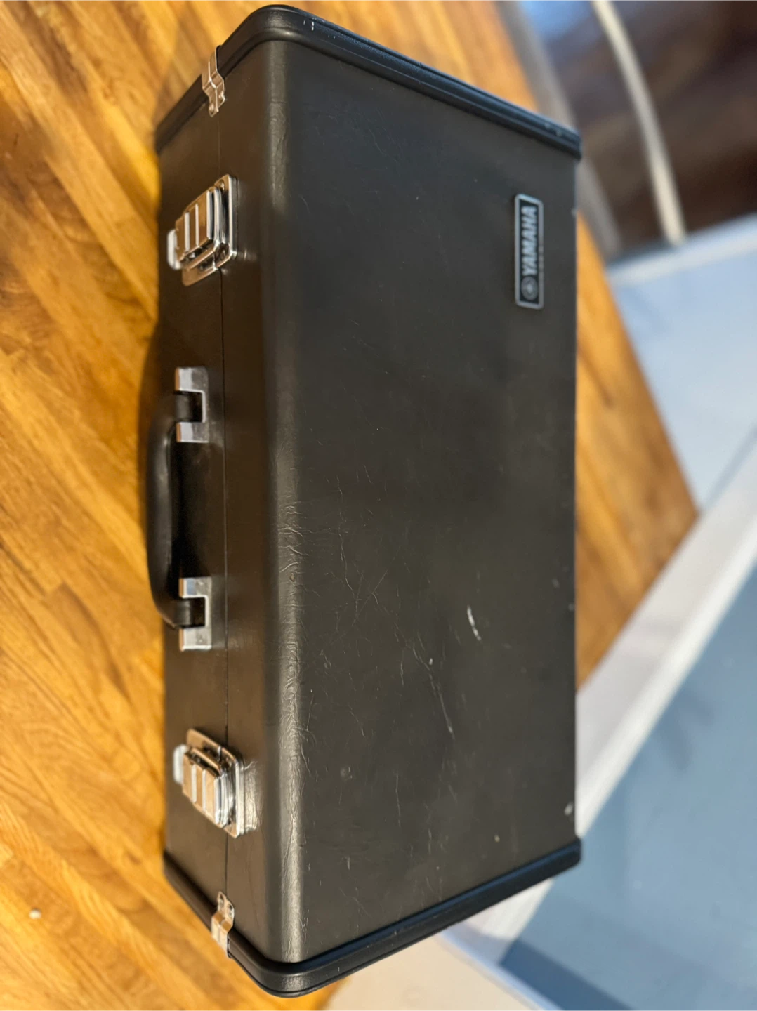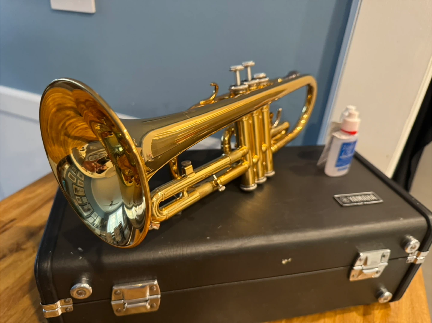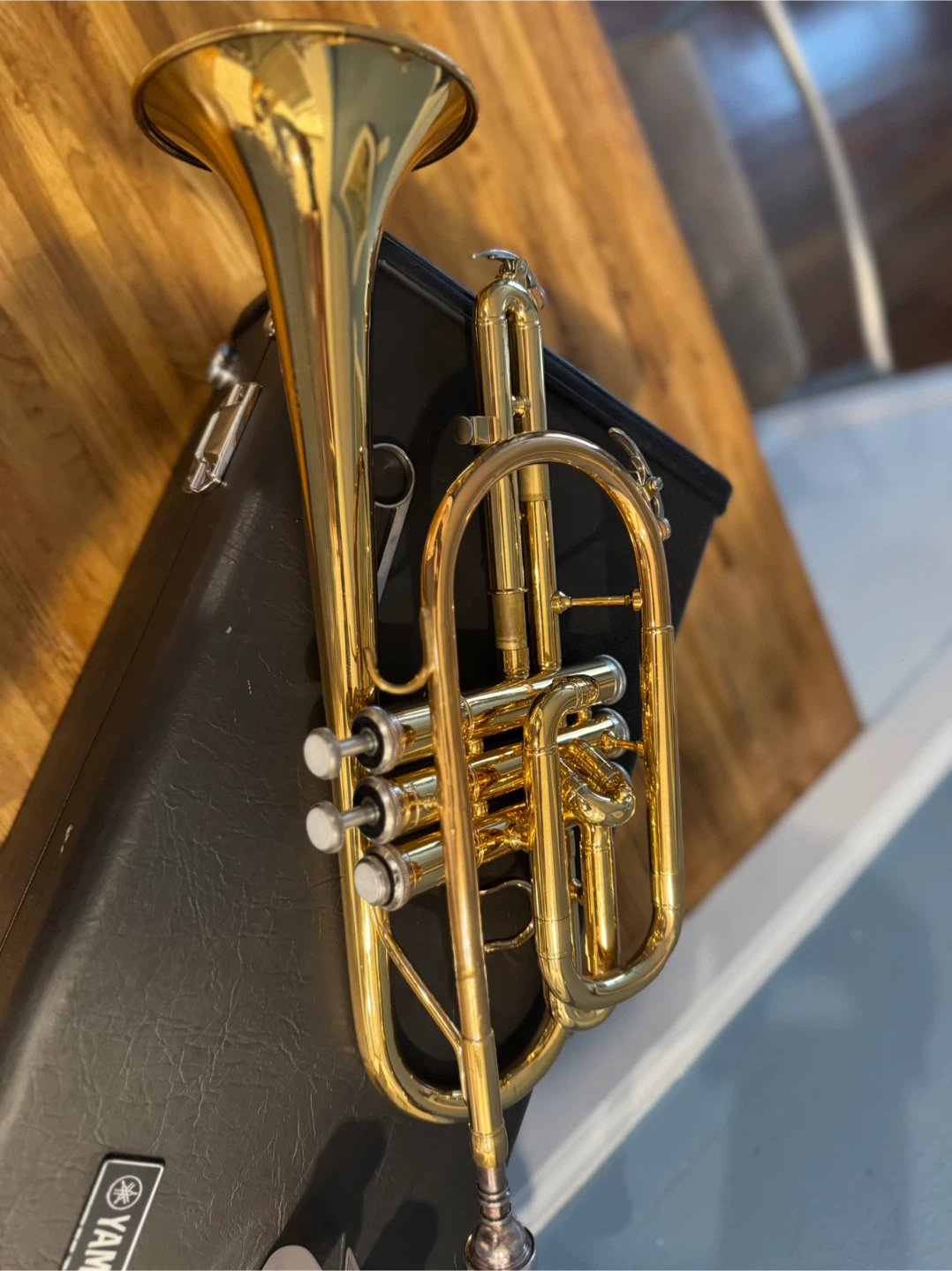 This is a gold-colored Yamaha cornet in amazing condition. It comes with its original hard case and two small bottles of valve oil. It has one valve stuck that requires lubrication.