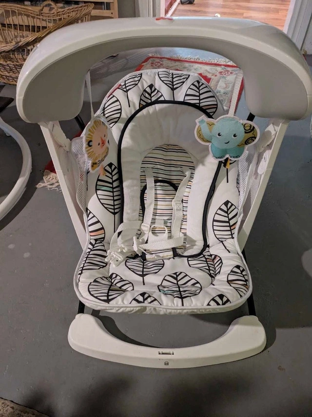 Get your little one swinging in comfort with this Fisher-Price baby swing, designed to soothe and entertain with its gentle motions and engaging features. This swing is in used condition and has been well-cared for. Key features include: Multiple swing speeds, a variety of soothing sounds and music, a comfortable, padded seat, and a mobile with engaging toys for visual stimulation. This Fisher-Price baby swing has been a delightful addition to our home. I'm hoping it can bring as much joy to your family as it did to ours! If the ad is still up, it's still available!