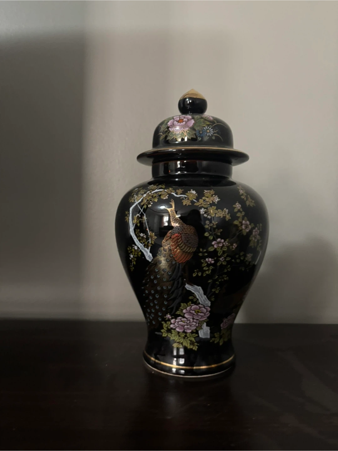 Elegant black vase featuring a beautiful peacock and floral design. Comes with a matching lid. Perfect for adding a touch of sophistication to any room!