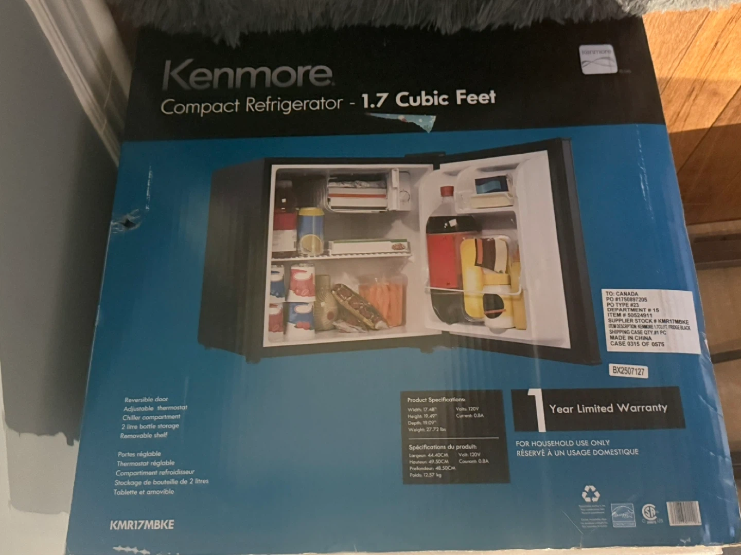 Selling a Kenmore compact refrigerator with 1.7 cubic feet of space! Brand new, never taken out of the box and ready to keep your drinks and snacks cool. It features: