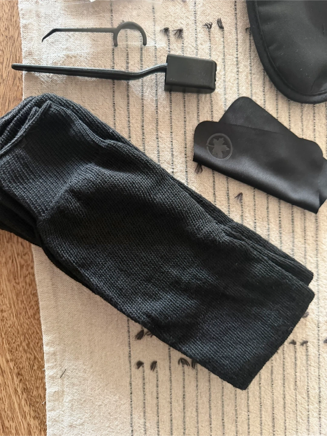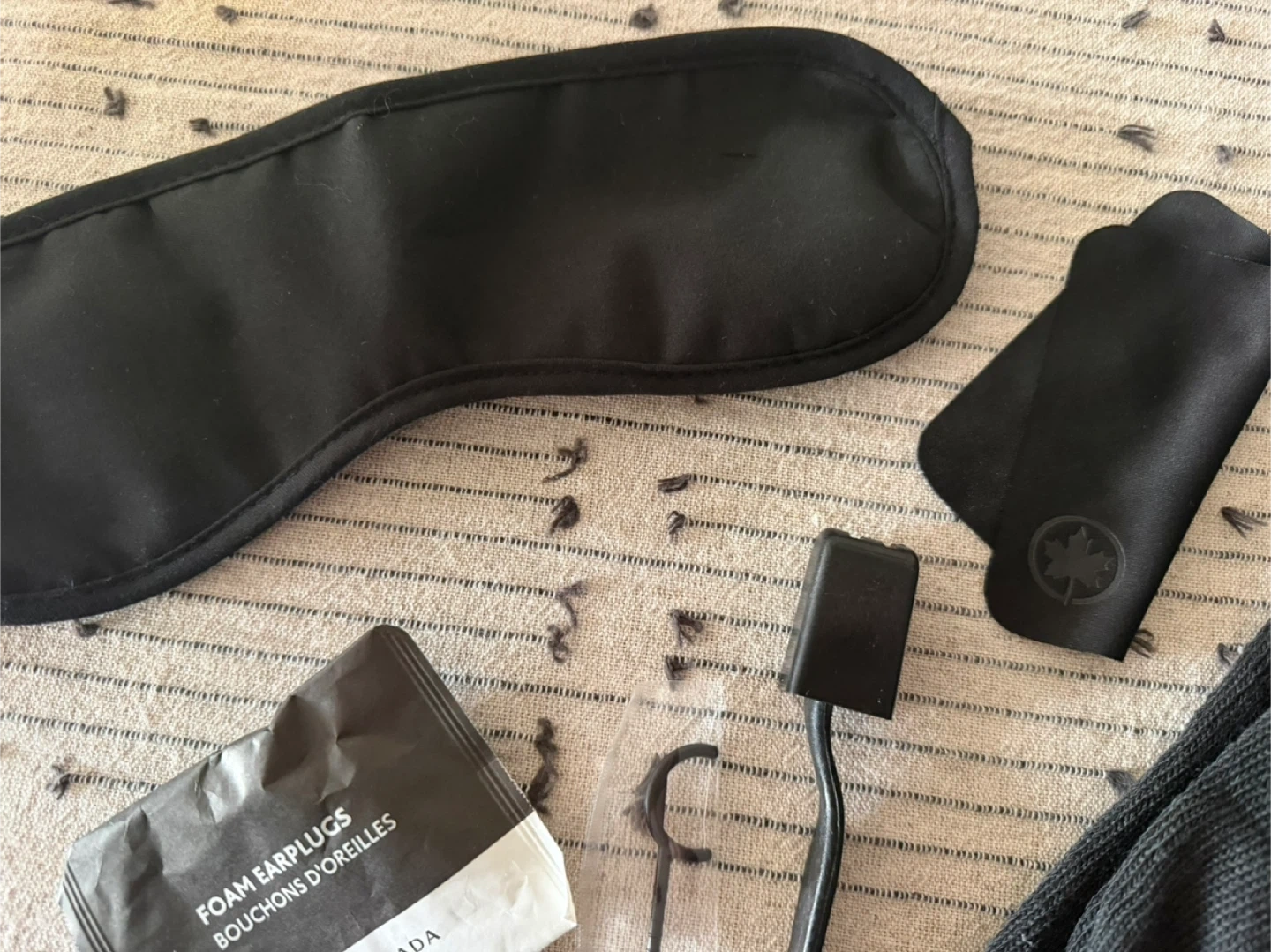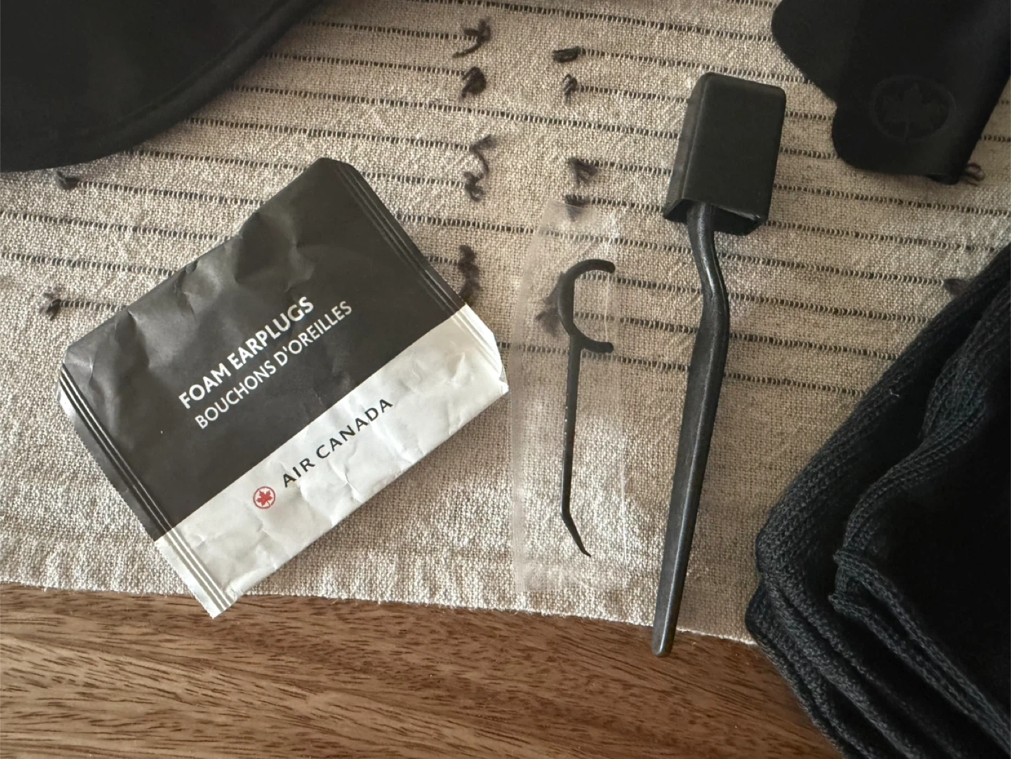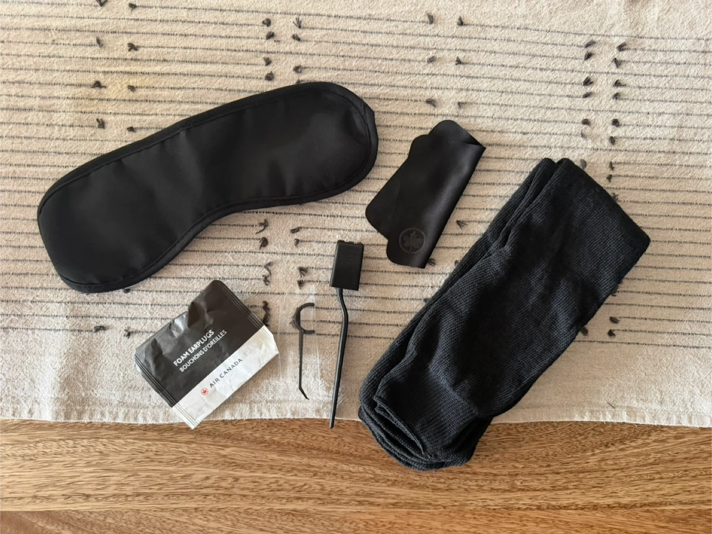 This Air Canada amenity kit includes a sleep mask, foam earplugs, socks, and a toothbrush and flosser. Brand new, never used.