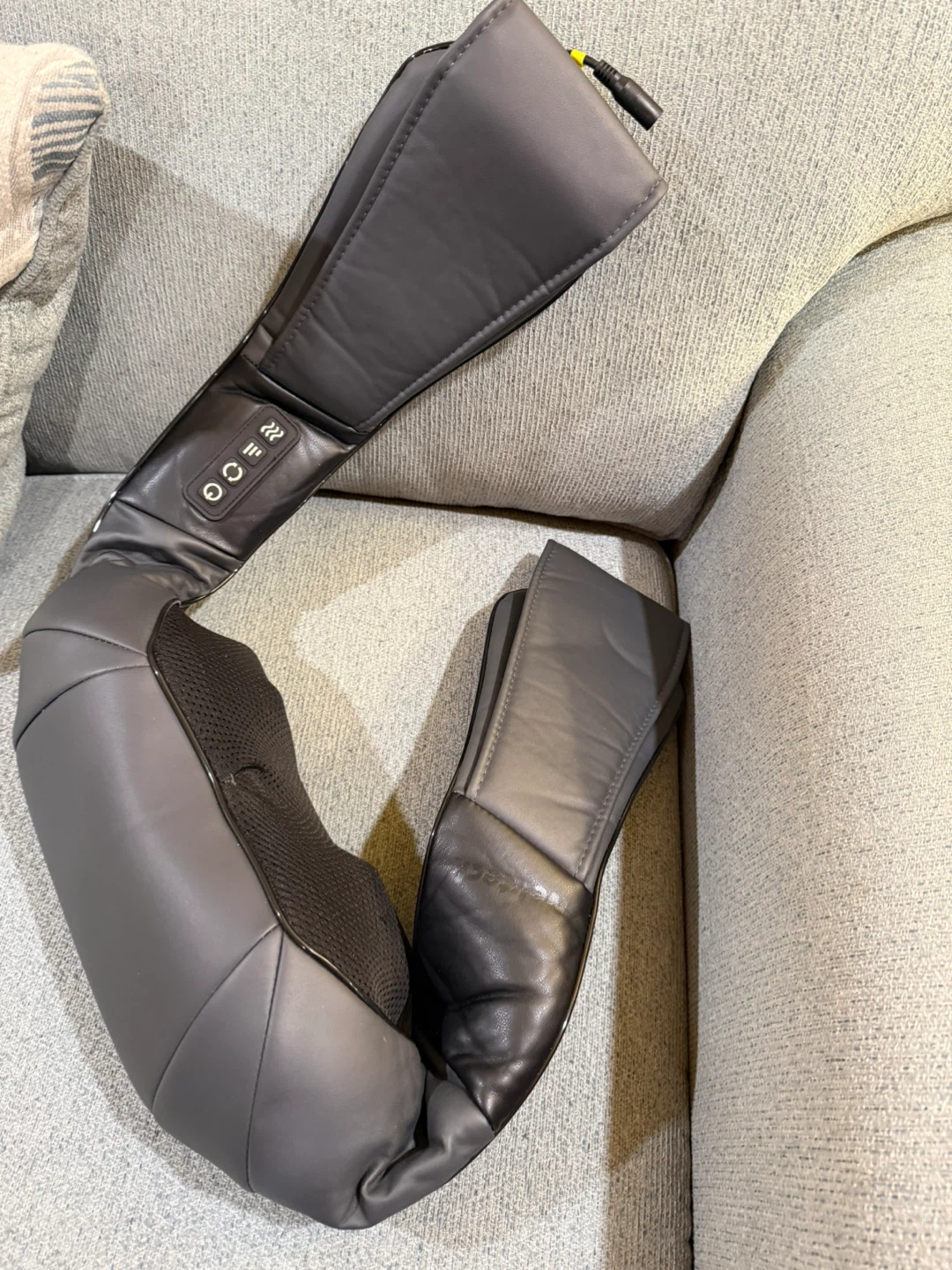 This electric massager targets your neck and shoulders. It features heat and multiple massage nodes for deep tissue relief. The ergonomic design wraps around your neck and shoulders for comfortable use.