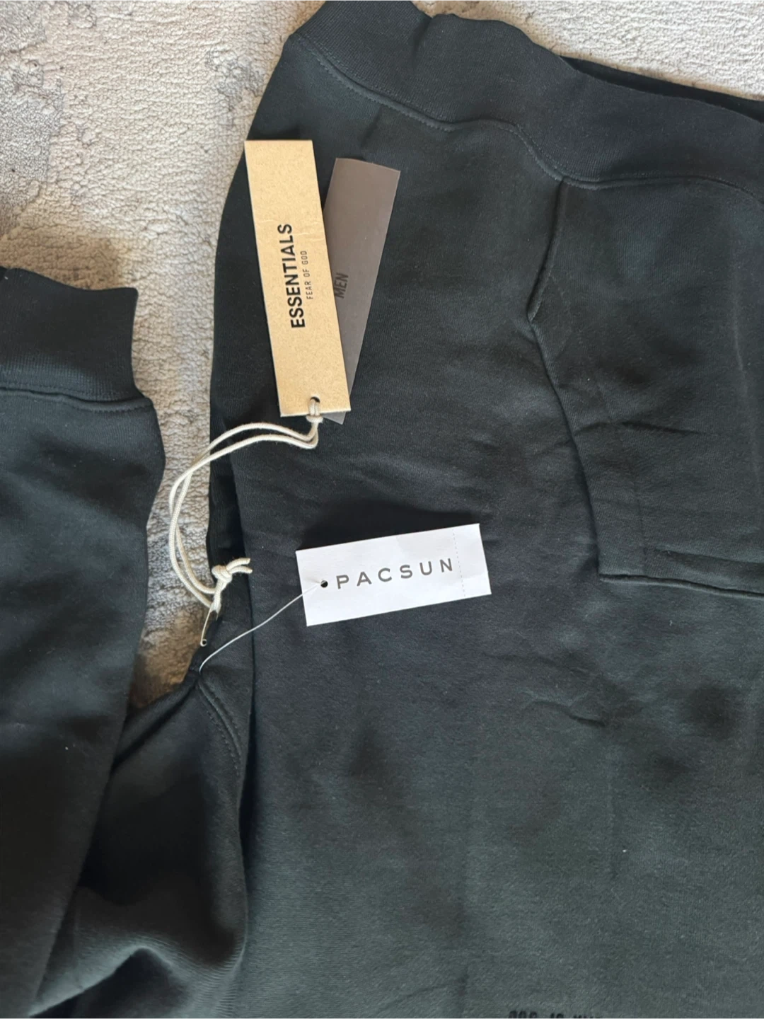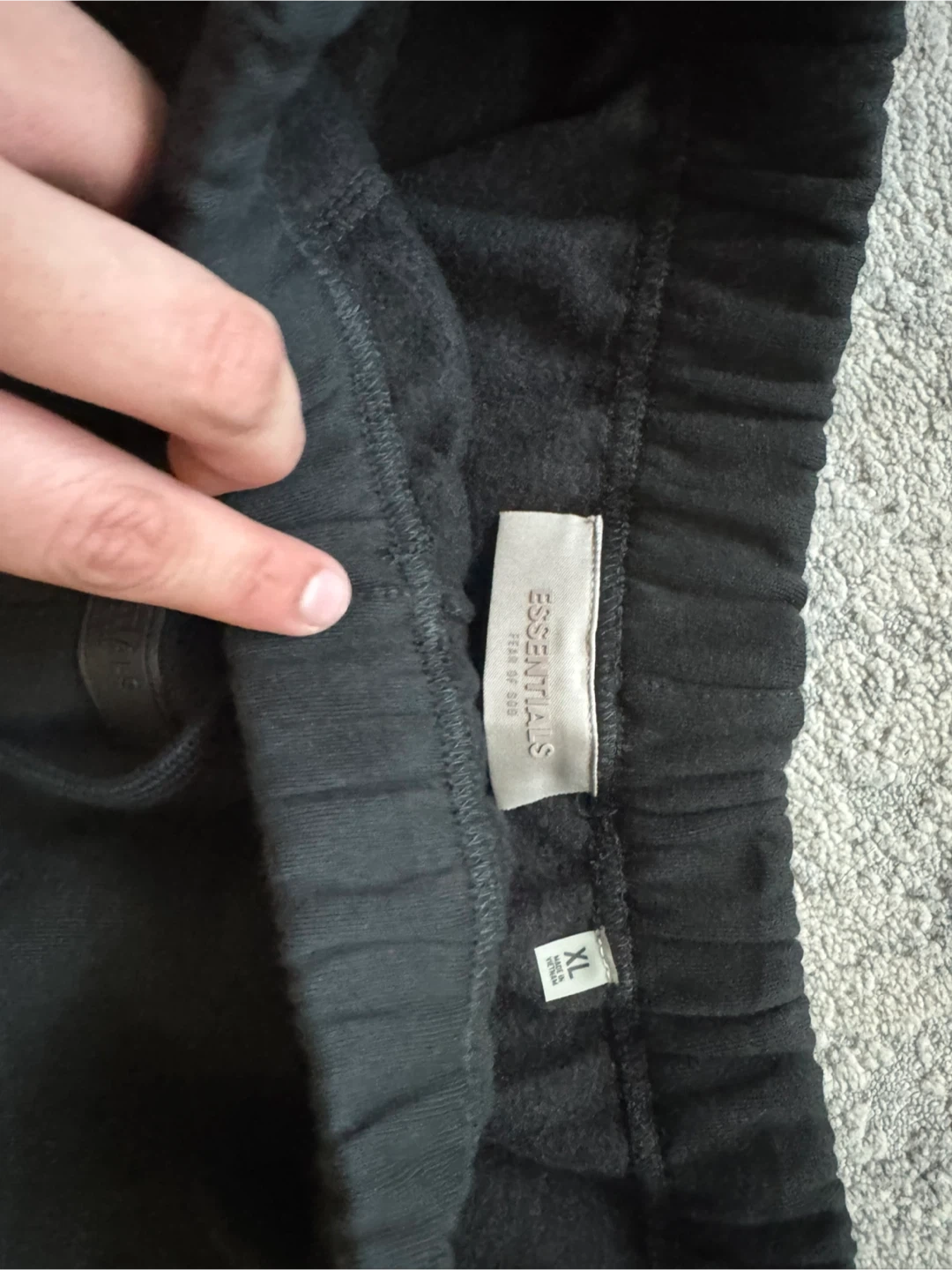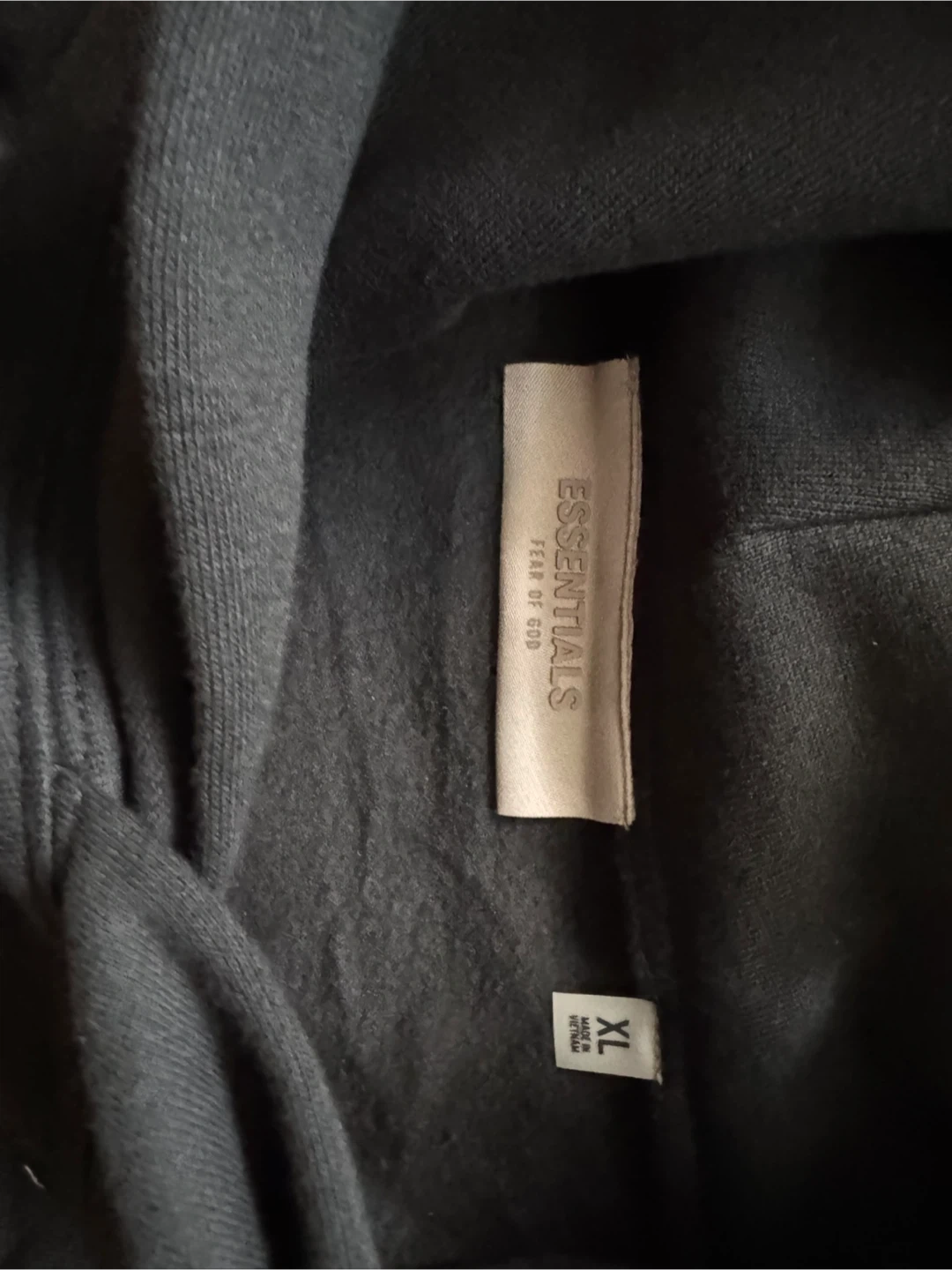This is a black Fear of God Essentials hoodie and sweatpants set. Both pieces are size XL. Made in Vietnam. Got is as a gift but wrong size. Authentic bought from PACSUN