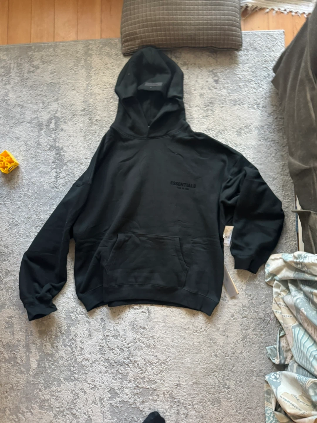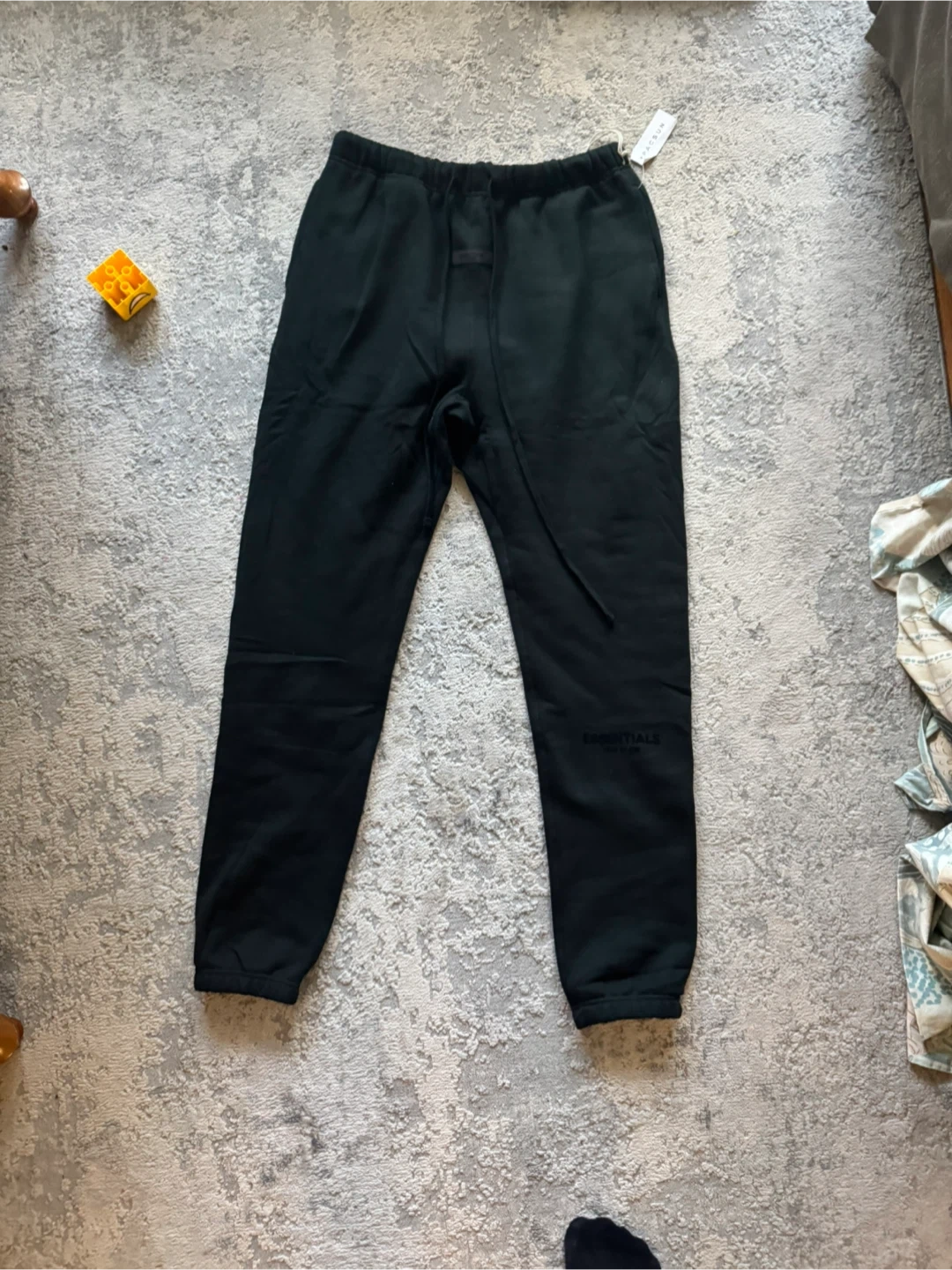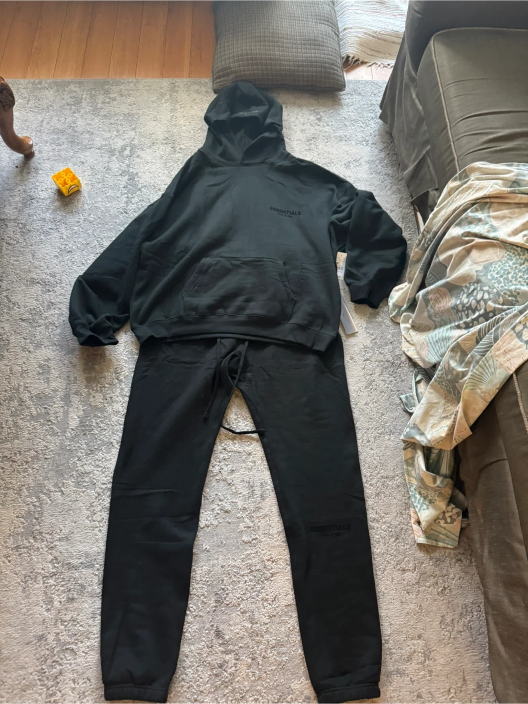 This is a black Fear of God Essentials hoodie and sweatpants set. Both pieces are size XL. Made in Vietnam. Got is as a gift but wrong size. Authentic bought from PACSUN