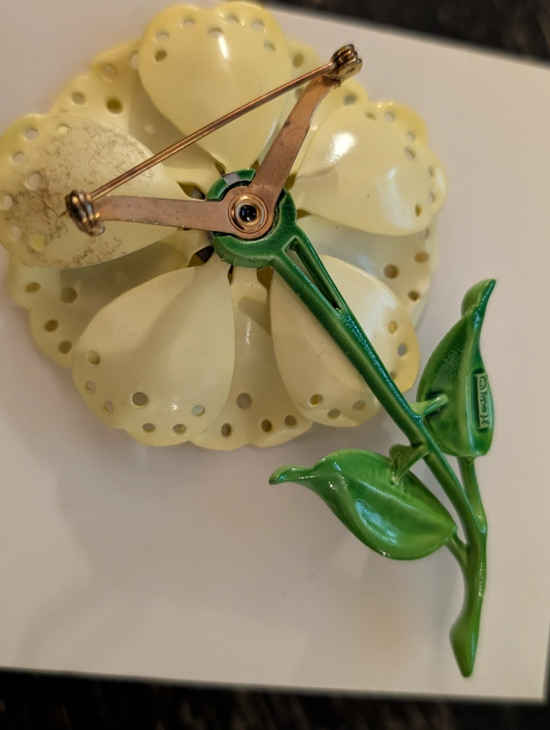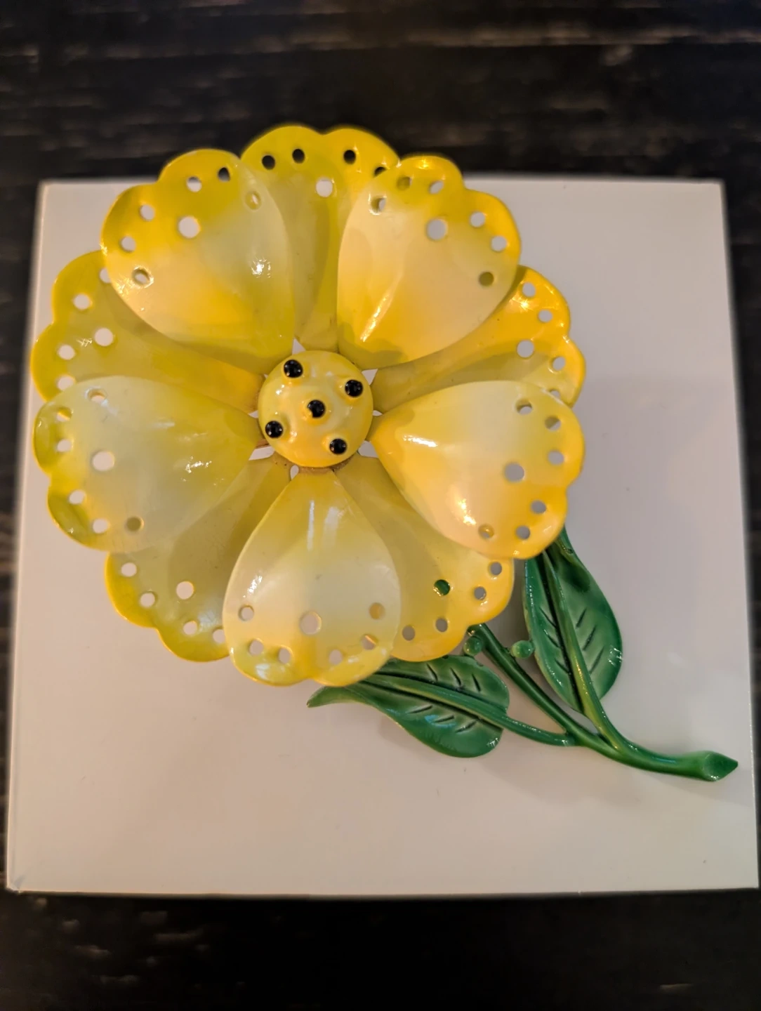 This is a vintage Hedy flower brooch. It features yellow enamel petals with green enamel leaves and stem. The clasp on the back is secure. Measures 3 and 3/4 inch high.