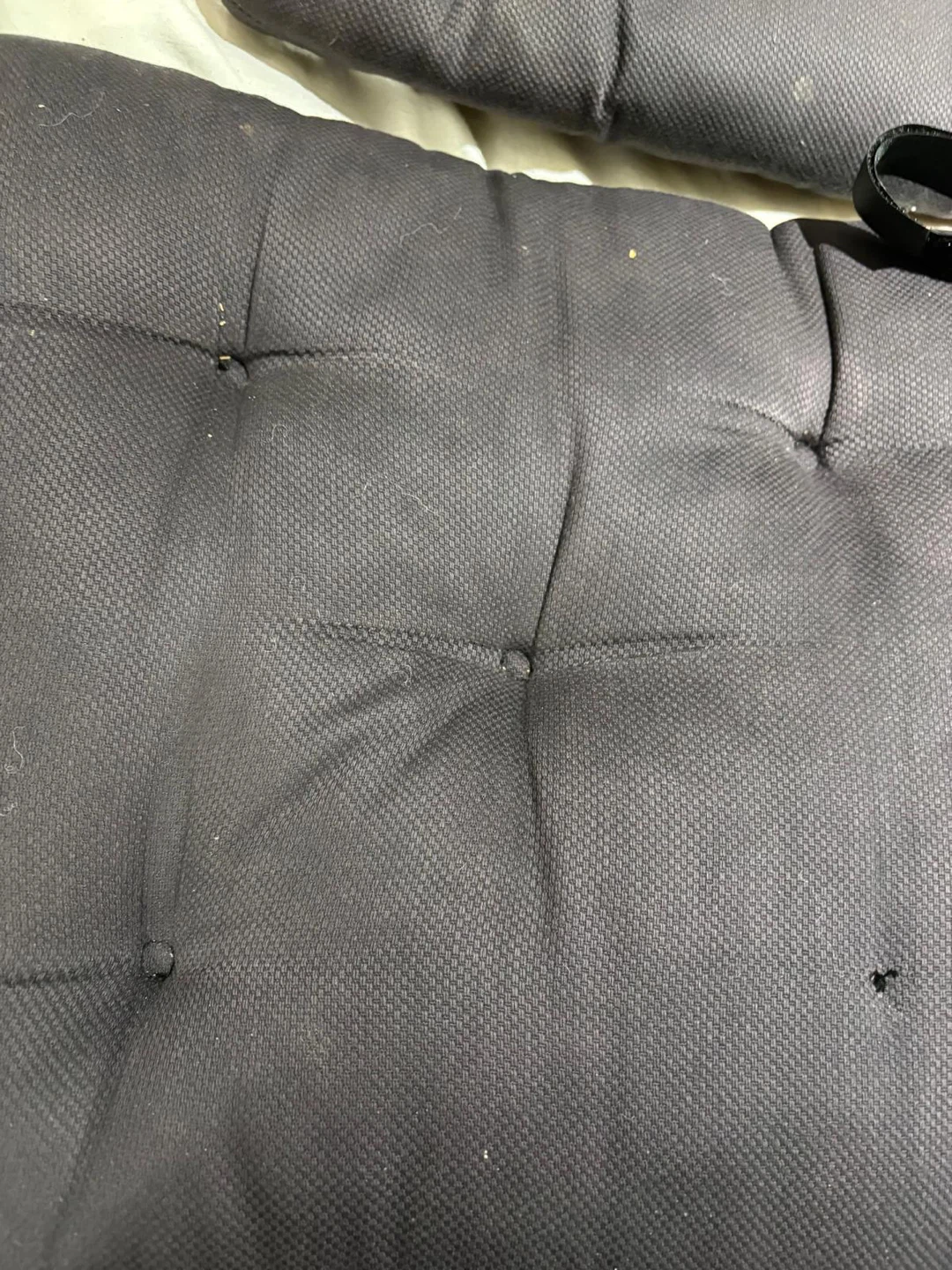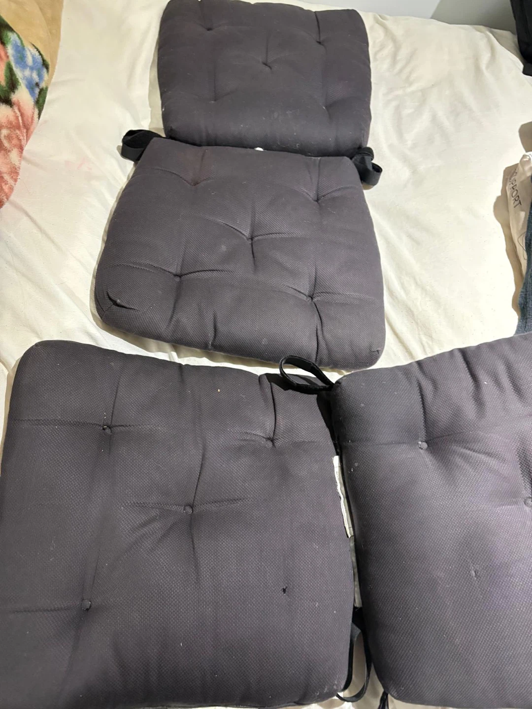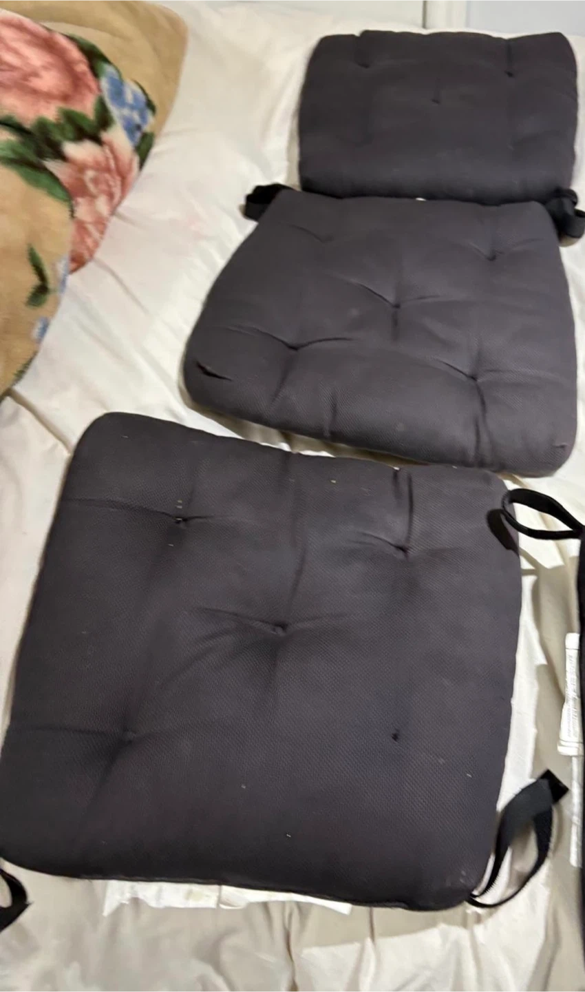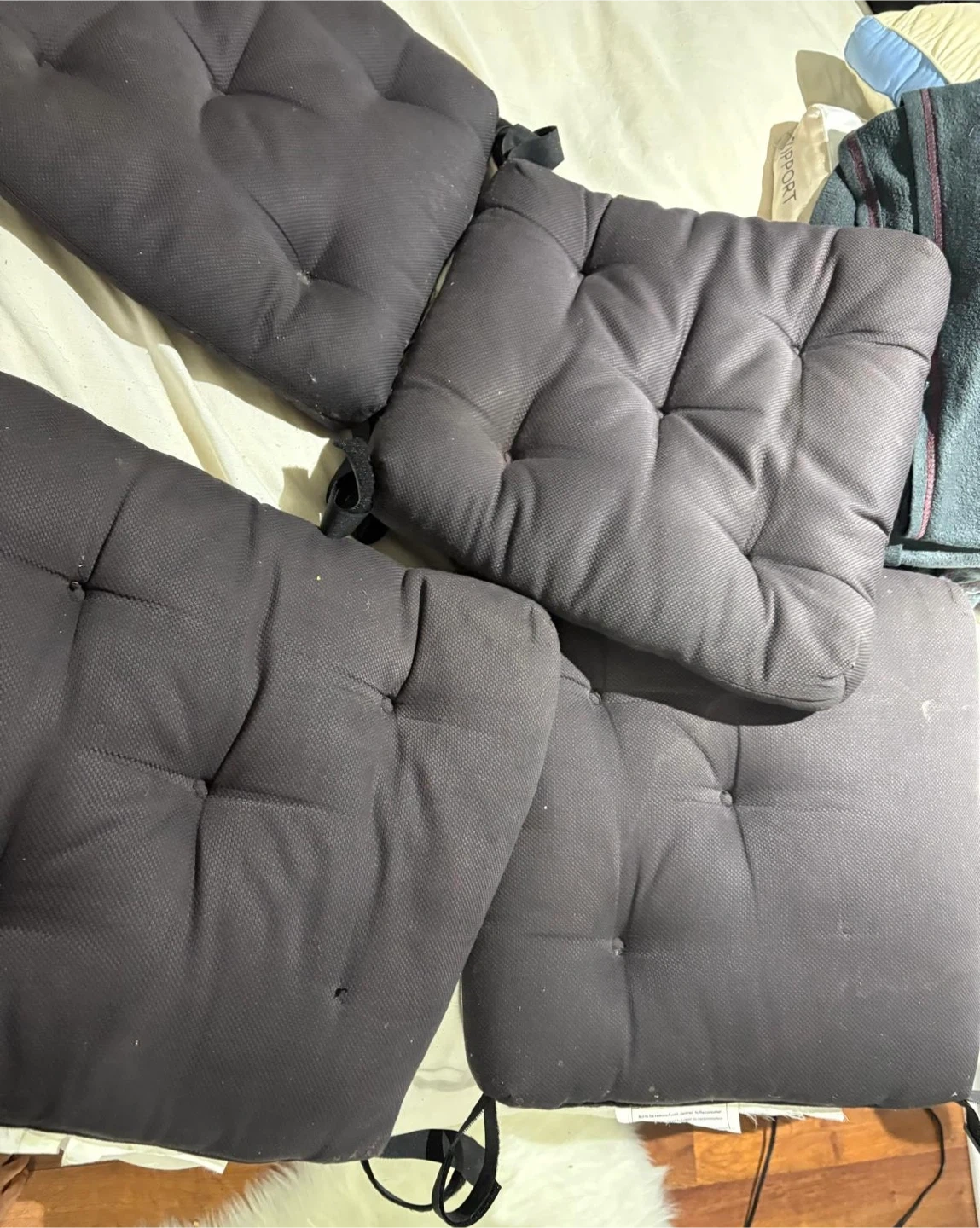 Set of four black seat cushions with ties. Fabric appears durable and suitable for outdoor use. These cushions will add comfort to your patio chairs. Pick up from Maple Vaughan. Major intersection keele and Rutherford. Near Rutherford go station
