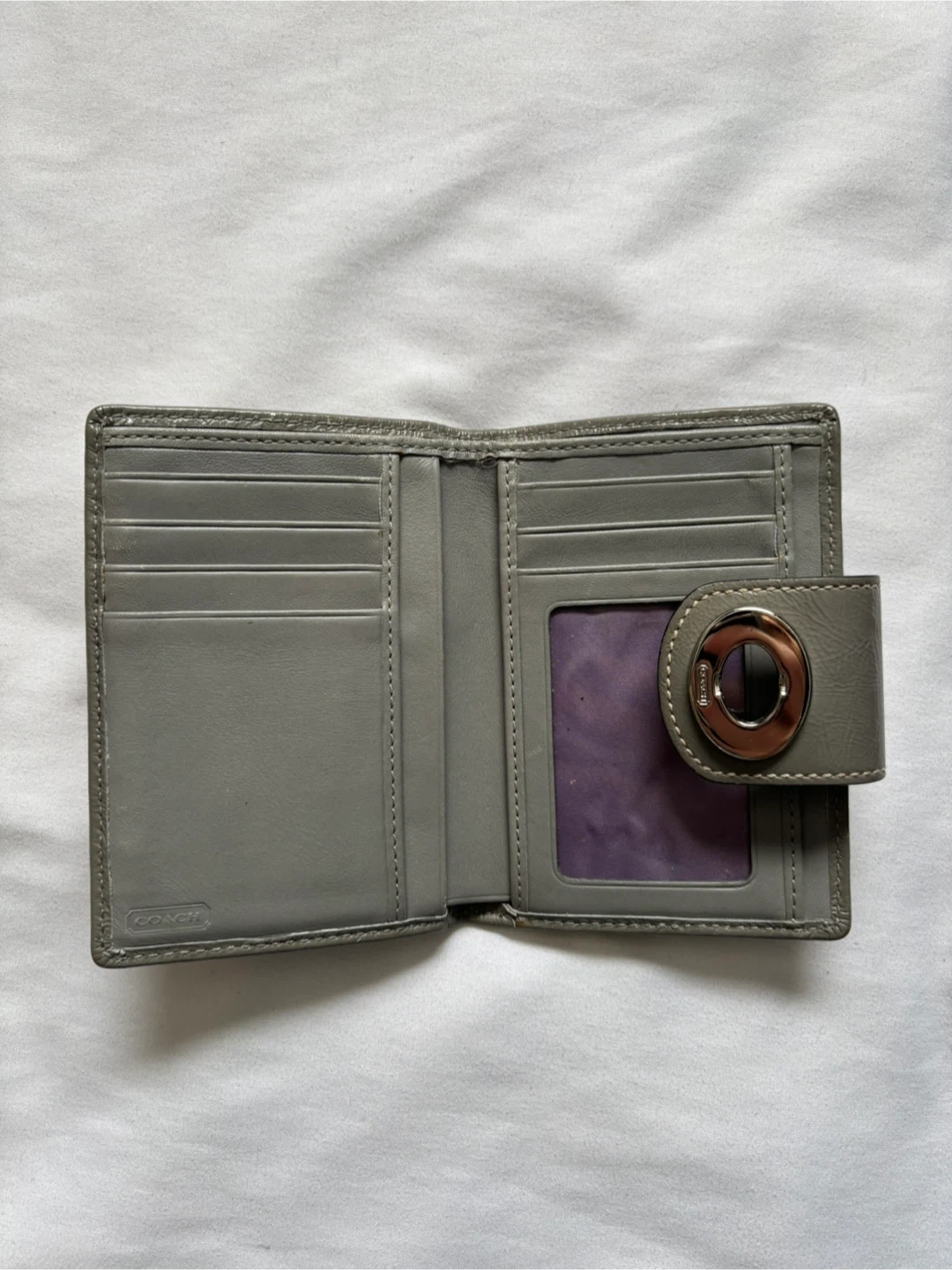 This is a pre-owned Coach bifold wallet featuring the signature C pattern. It's grey with a grey patent leather snap closure and a zippered coin pocket on the back. Plenty of card slots and a clear ID window inside.